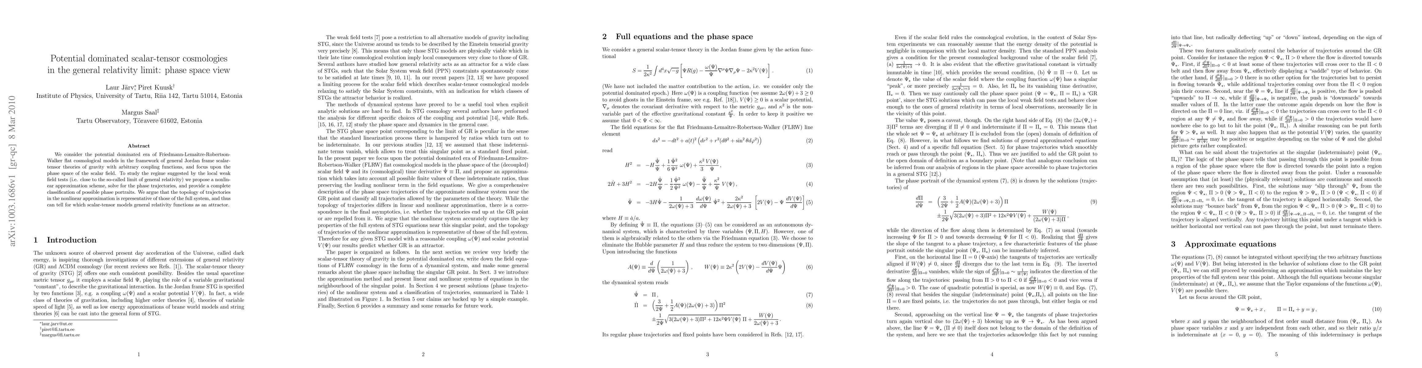 This paper investigates potential-dominated cosmological models within scalar-tensor theories, focusing on the phase space of the scalar field. It proposes a nonlinear approximation scheme to classify phase trajectories and argues that these trajectories' topology reflects the behavior of the full system, determining which models exhibit general relativity as an attractor.