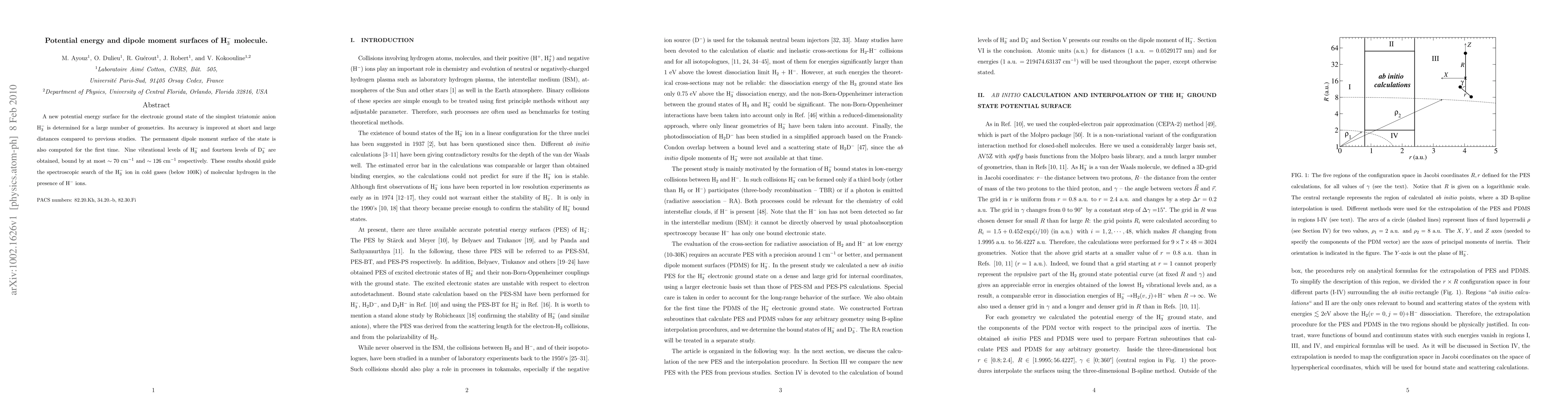 A new potential energy surface for the electronic ground state of the simplest triatomic anion H3- is determined for a large number of geometries. Its accuracy is improved at short and large distances compared to previous studies. The permanent dipole moment surface of the state is also computed for the first time. Nine vibrational levels of H3- and fourteen levels of D3- are obtained, bound by at most ~70 cm^{-1} and ~ 126 cm^{-1} respectively. These results should guide the spectroscopic search of the H3- ion in cold gases (below 100K) of molecular hydrogen in the presence of H3- ions.