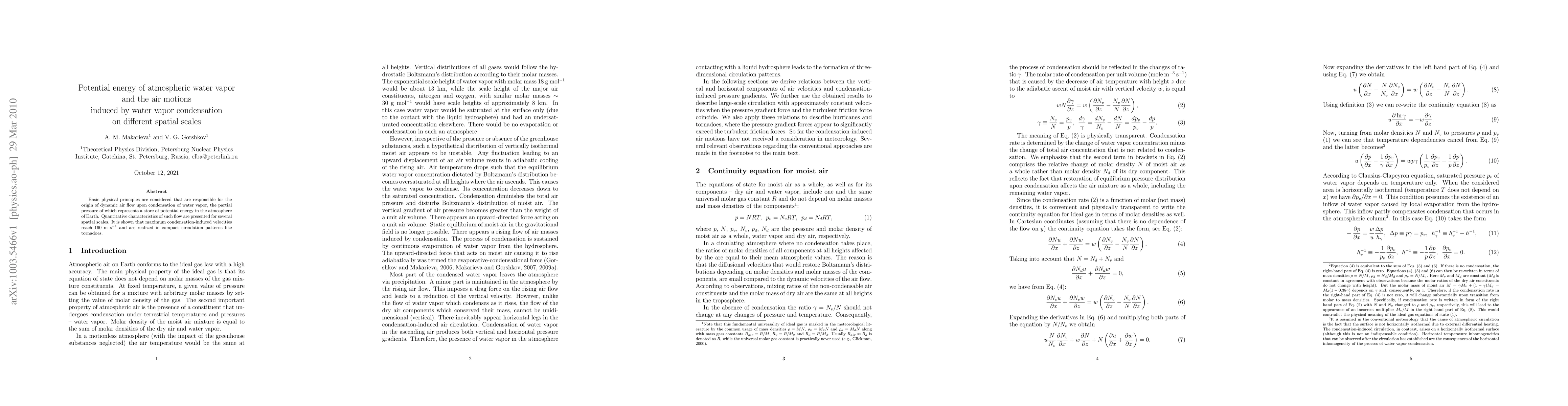This paper explores the dynamic air flows generated by the condensation of atmospheric water vapor, which stores potential energy. It quantifies these flows across different spatial scales, revealing maximum condensation-induced velocities of up to 160 m/s in compact patterns like tornadoes.