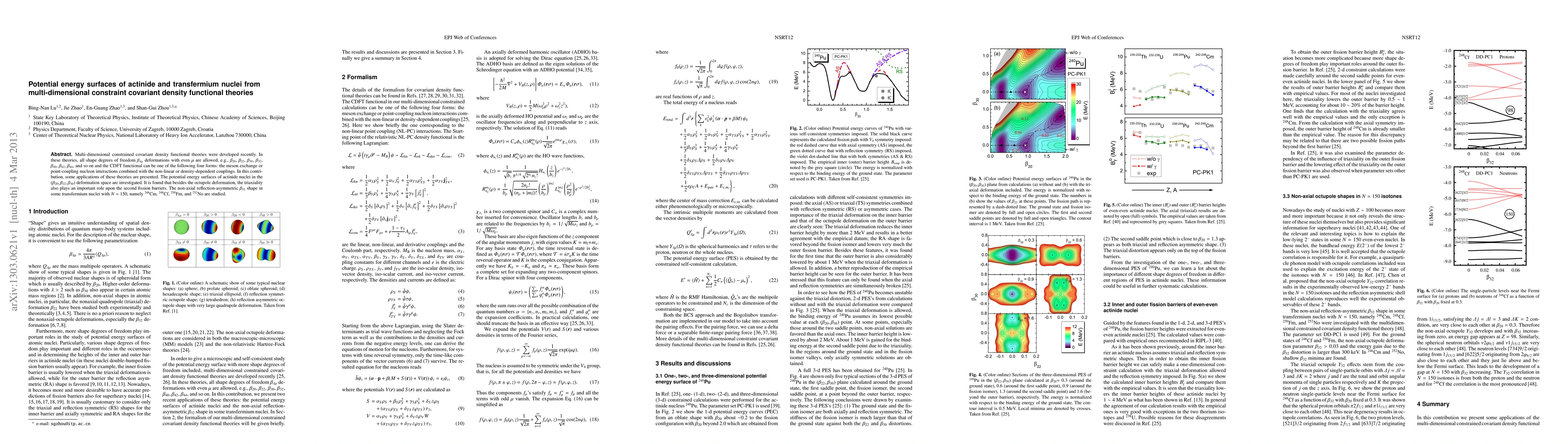 This paper explores the potential energy surfaces of actinide and transfermium nuclei using multi-dimensional constrained covariant density functional theories, revealing the significance of triaxiality and octupole deformations on fission barriers. It also investigates the non-axial reflection-asymmetric shapes in certain heavy nuclei.
