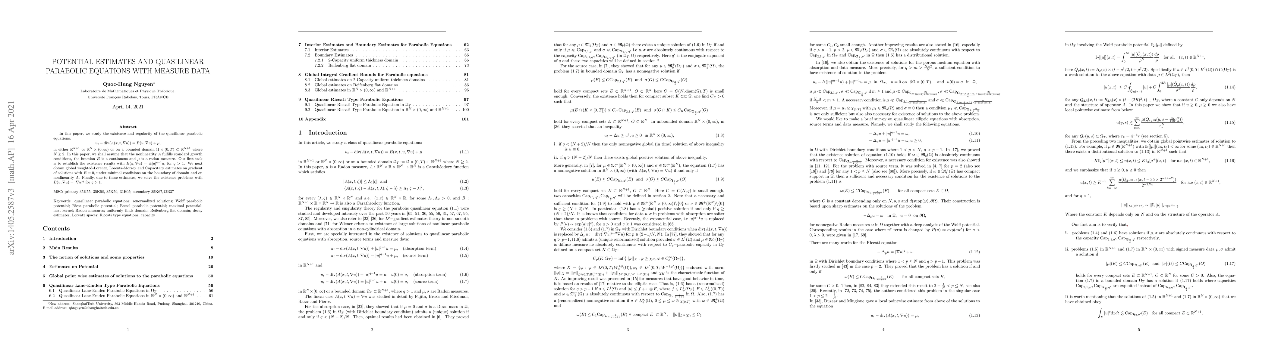 In this paper, we study the existence and regularity of the quasilinear parabolic equations: $$u_t-\operatorname{div}(A(x,t,\nabla u))=B(u,\nabla u)+\mu,$$ in either $\mathbb{R}^{N+1}$ or $\mathbb{R}^N\times(0,\infty)$ or on a bounded domain $\Omega\times (0,T)\subset\mathbb{R}^{N+1}$ where $N\geq 2$. In this paper, we shall assume that the nonlinearity $A$ fulfills standard growth conditions, the function $B$ is a continuous and $\mu$ is a radon measure. Our first task is to establish the existence results with $B(u,\nabla u)=\pm|u|^{q-1}u$, for $q>1$. We next obtain global weighted-Lorentz, Lorentz-Morrey and Capacitary estimates on gradient of solutions with $B\equiv 0$, under minimal conditions on the boundary of domain and on nonlinearity $A$. Finally, due to these estimates, we solve the existence problems with $B(u,\nabla u)=|\nabla u|^q$ for $q>1$