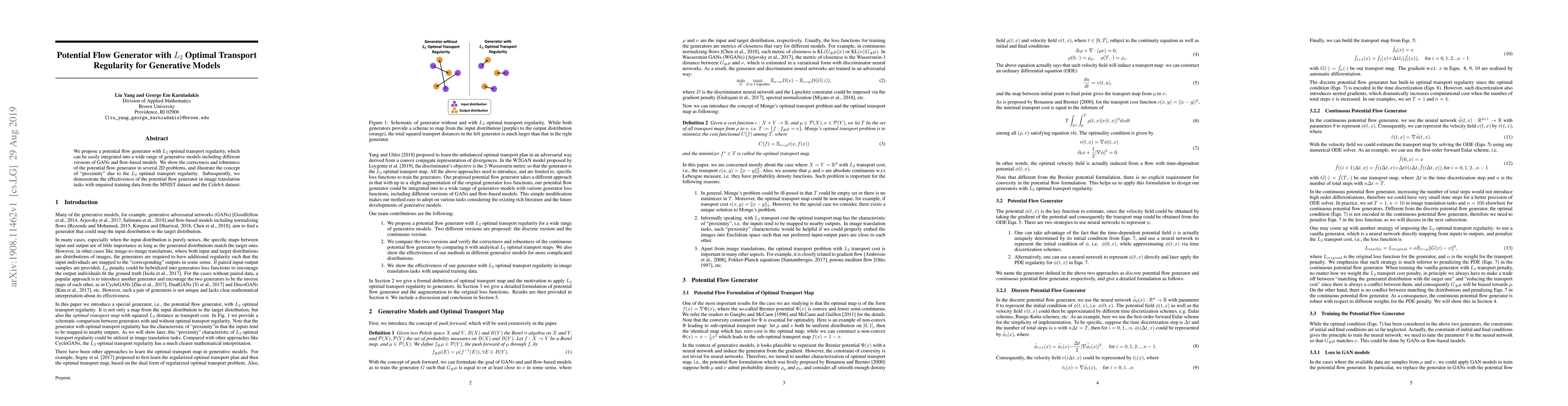 We propose a potential flow generator with $L_2$ optimal transport regularity, which can be easily integrated into a wide range of generative models including different versions of GANs and flow-based models. We show the correctness and robustness of the potential flow generator in several 2D problems, and illustrate the concept of "proximity" due to the $L_2$ optimal transport regularity. Subsequently, we demonstrate the effectiveness of the potential flow generator in image translation tasks with unpaired training data from the MNIST dataset and the CelebA dataset.