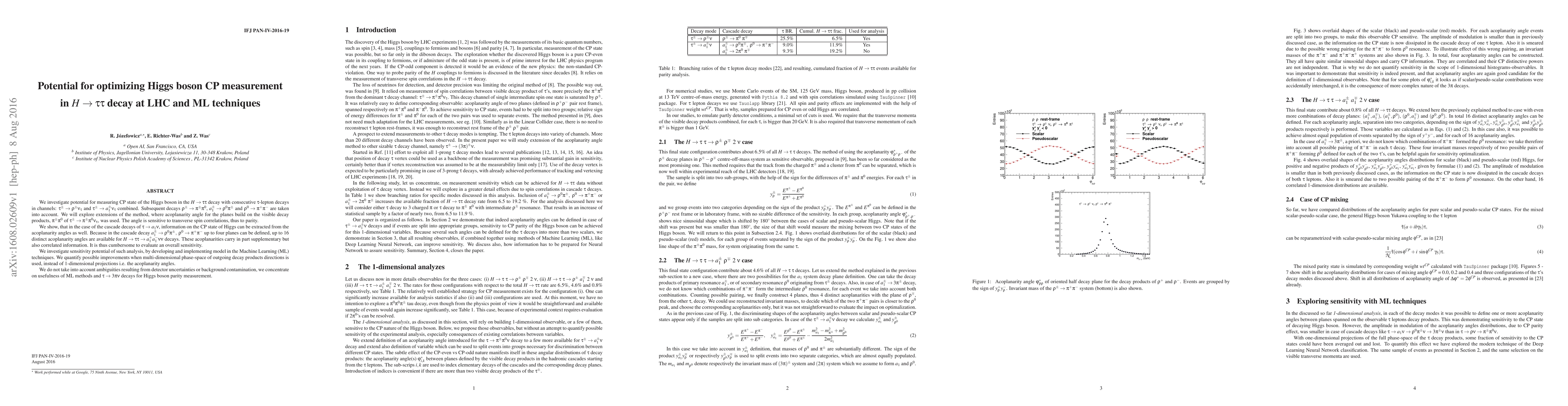 We investigate potential for measuring CP state of the Higgs boson in the H to tau tau$ decay with consecutive tau-lepton decays in channels: tau^+- to rho^+- nu_tau and tau^+- to a1^+- nu_tau combined. Subsequent decays rho^+- to pi^+- pi^0, a1^+- to rho^0 pi^+- and rho^0 to pi^+ pi^- are taken into account. We will explore extensions of the method, where acoplanarity angle for the planes build on the visible decay products, pi^+- pi^0 of tau^+- to pi^pm pi^0 nu_tau, was used. The angle is sensitive to transverse spin correlations, thus to parity. We show, that in the case of the cascade decays of tau to a1 nu, information on the CP state of Higgs can be extracted from the acoplanarity angles as well. Because in the cascade decay a1^+- to rho^0 pi^pm,rho^0 to pi^+ pi^- up to four planes can be defined, up to 16 distinct acoplanarity angles are available for H \to tau tau to a1^+ a1^- nu nu decays. These acoplanarities carry in part supplementary but also correlated information. It is thus cumbersome to evaluate an overall sensitivity. We investigate sensitivity potential of such analysis, by developing and implementing model in the Machine Learning (ML) techniques. We quantify possible improvements when multi-dimensional phase-space of outgoing decay products directions is used, instead of 1-dimensional projections i.e. the acoplanarity angles. We do not take into account ambiguities resulting from detector uncertainties or background contamination, we concentrate on usefulness of ML methods and tau to 3pi nu decays for Higgs boson parity measurement.