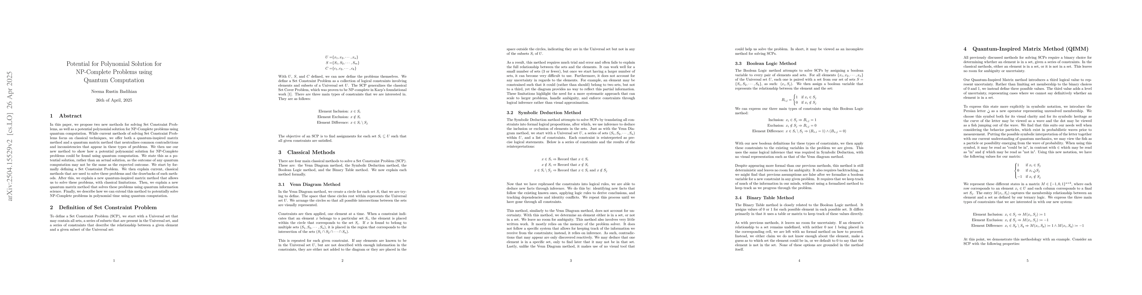 The paper introduces novel quantum-inspired and quantum matrix methods for solving Set Constraint Problems, extending to potentially solve NP-Complete problems in polynomial time using quantum computation.