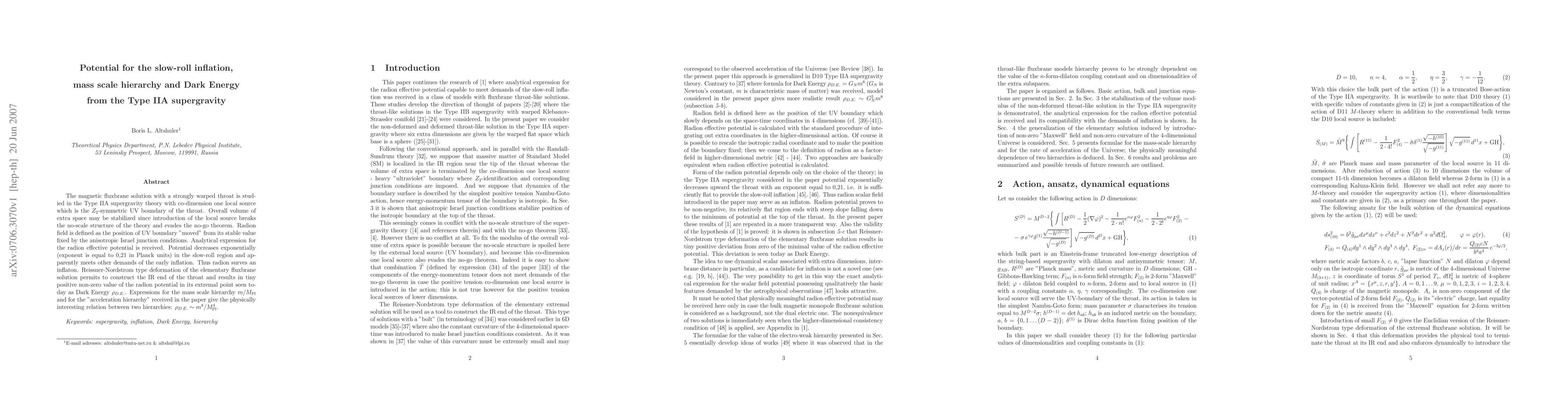 The magnetic fluxbrane solution with a strongly warped throat is studied in the Type IIA supergravity theory with co-dimension one local source which surves as $Z_{2}$-symmetric UV boundary of the throat. Overall volume of extra space is stabilized since introduction of the local source breaks the no-scale structure of the theory and evades the no-go theorem. Radion field is defined as the position of UV boundary "moved" from its stable value fixed by the anisotropic Israel junction conditions. Analytical expression for the radion effective potential is received. Potential decreases exponentially (exponent is equal to 0,21 in Planck units) in the slow-roll region and apparently meets other demands of the early inflation. Reissner-Nordstrom type deformation of the elementary fluxbrane solution permits to construct the IR end of the throat and results in tiny positive non-zero value of the radion potential in its extremal point seen today as Dark Energy $\rho_{D.E.}$. Expressions for the mass scale hierarchy and for the "acceleration hierarchy" received in the paper give the physically interesting relation between two hierarchies: $\rho_{D.E.} \sim G_{N}^{2}m^{8}$.