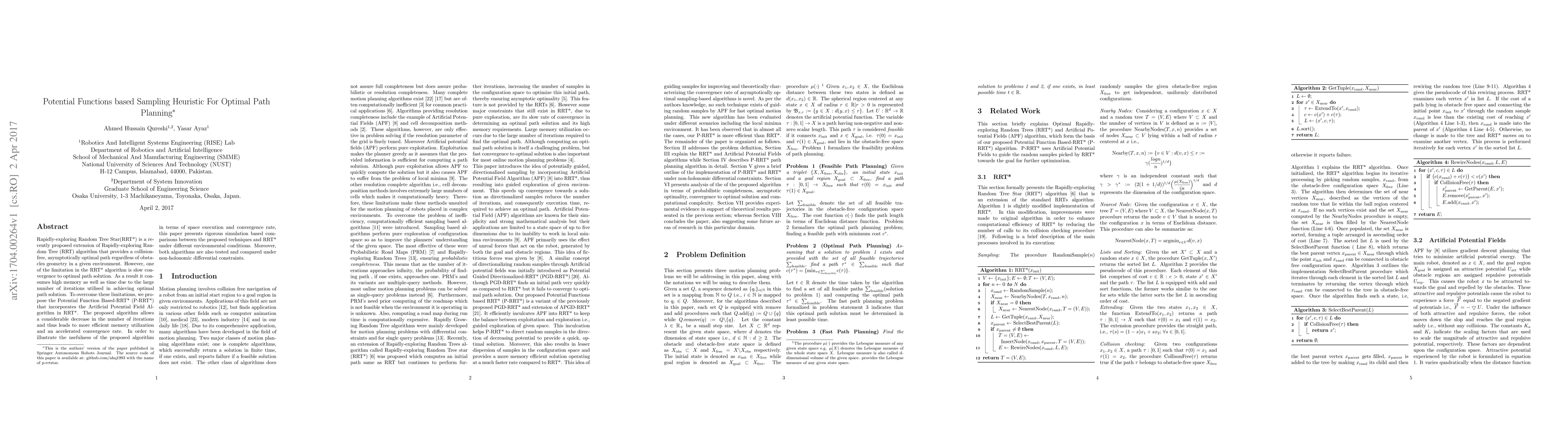 Rapidly-exploring Random Tree Star(RRT*) is a recently proposed extension of Rapidly-exploring Random Tree (RRT) algorithm that provides a collision-free, asymptotically optimal path regardless of obstacle's geometry in a given environment. However, one of the limitations in the RRT* algorithm is slow convergence to optimal path solution. As a result, it consumes high memory as well as time due to a large number of iterations utilised in achieving optimal path solution. To overcome these limitations, we propose the Potential Function Based-RRT* (P-RRT*) that incorporates the Artificial Potential Field Algorithm in RRT*. The proposed algorithm allows a considerable decrease in the number of iterations and thus leads to more efficient memory utilization and an accelerated convergence rate. In order to illustrate the usefulness of the proposed algorithm in terms of space execution and convergence rate, this paper presents rigorous simulation based comparisons between the proposed techniques and RRT* under different environmental conditions. Moreover, both algorithms are also tested and compared under non-holonomic differential constraints.