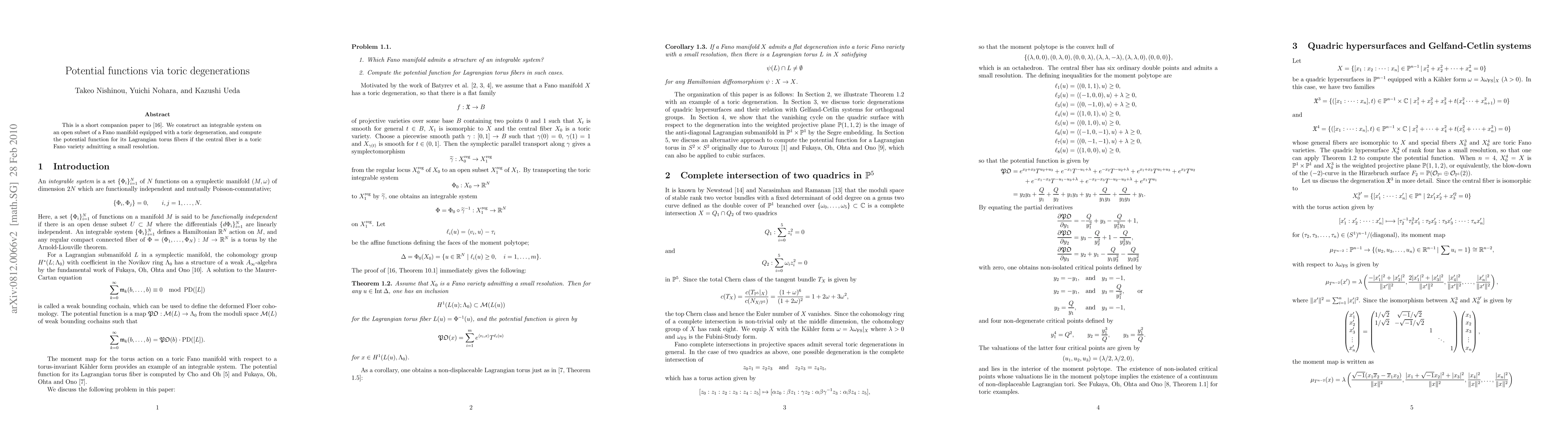 Researchers construct an integrable system on a Fano manifold with toric degeneration, computing potential functions for its fibers if the central fiber is a toric variety with small resolution.