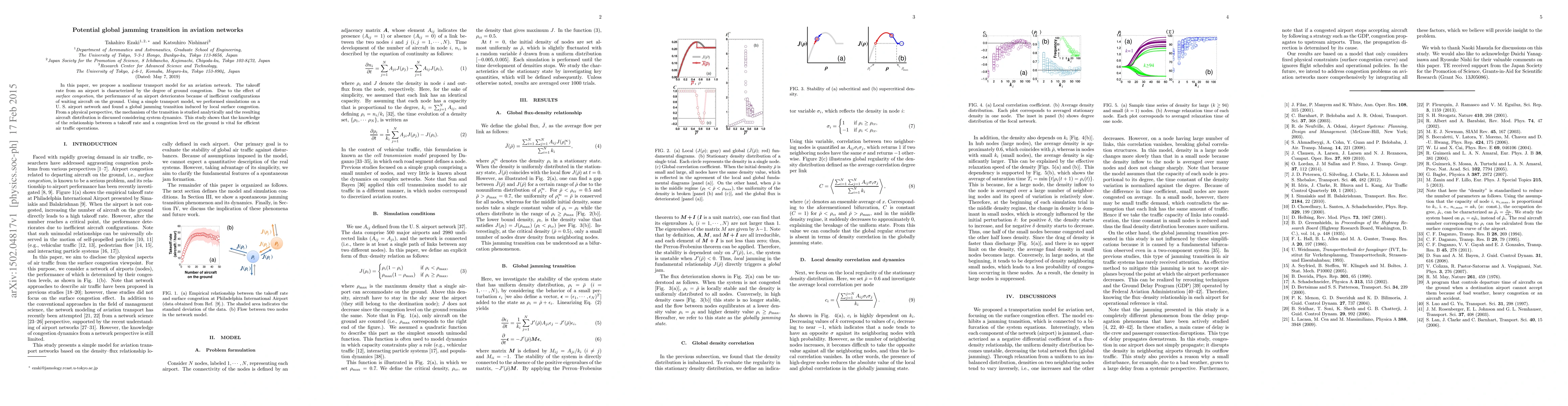 The paper introduces a novel nonlinear transport model for aviation networks that captures surface congestion effects and identifies a global jamming transition.