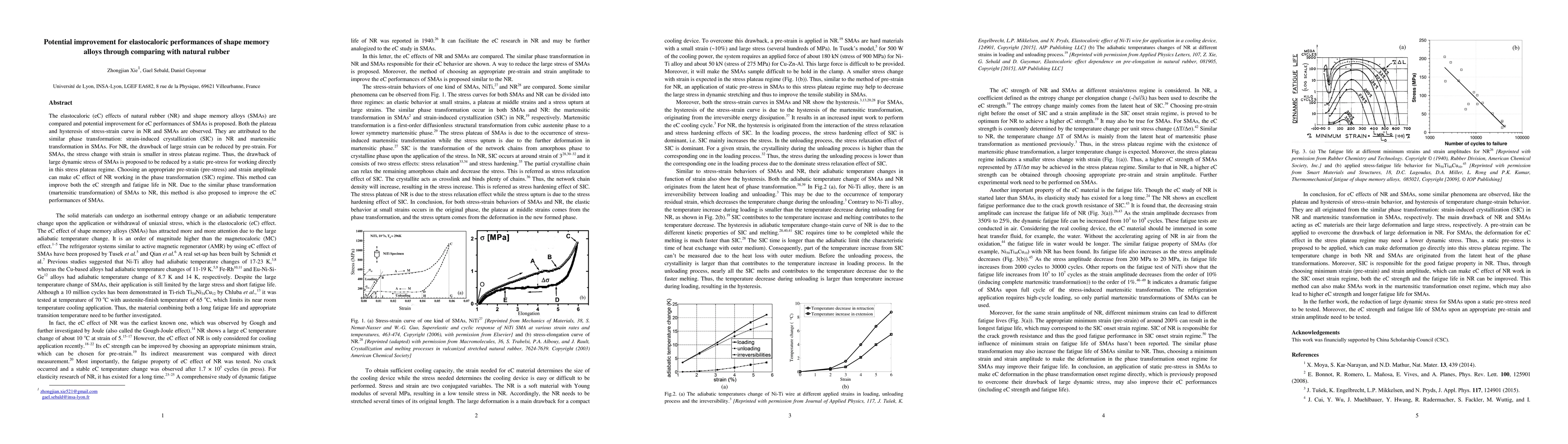The elastocaloric (eC) effects of natural rubber (NR) and shape memory alloys (SMAs) are compared and potential improvement for eC performances of SMAs is proposed. Both the plateau and hysteresis of stress-strain curve in NR and SMAs are observed. They are attributed to the similar phase transformation: strain-induced crystallization (SIC) in NR and martensitic transformation in SMAs. For NR, the drawback of large strain can be reduced by pre-strain. For SMAs, the stress change with strain is smaller in stress plateau regime. Thus, the drawback of large dynamic stress of SMAs is proposed to be reduced by a static pre-stress for working directly in this stress plateau regime. Choosing an appropriate pre-strain (pre-stress) and strain amplitude can make eC effect of NR working in the phase transformation (SIC) regime. This method can improve both the eC strength and fatigue life in NR. Due to the similar phase transformation (martensitic transformation) of SMAs to NR, this method is also proposed to improve the eC performances of SMAs.