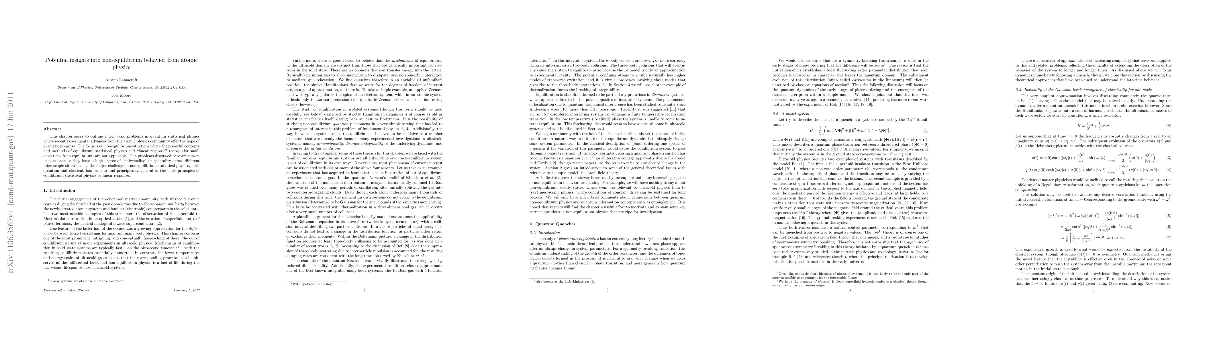 This chapter seeks to outline a few basic problems in quantum statistical physics where recent experimental advances from the atomic physics community offer the hope of dramatic progress. The focus is on nonequilibrium situations where the powerful concepts and methods of equilibrium statistical physics and "linear response" theory (for small deviations from equilibrium) are not applicable. The problems discussed here are chosen in part because they have a high degree of "universality" or generality across different microscopic situations, as the major challenge in nonequilibrium statistical physics, both quantum and classical, has been to find principles as general as the basic principles of equilibrium statistical physics or linear response.