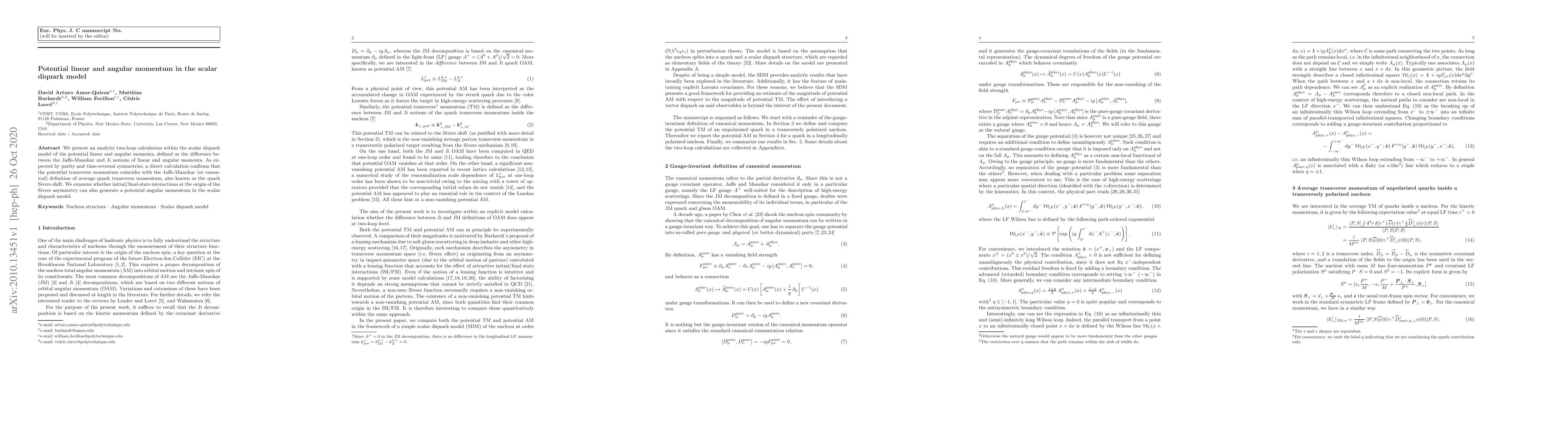 This paper conducts an analytic two-loop calculation within the scalar diquark model to determine potential linear and angular momenta, confirming that the potential transverse momentum aligns with the Jaffe-Manohar definition. It also investigates if initial/final-state interactions can generate a potential angular momentum.