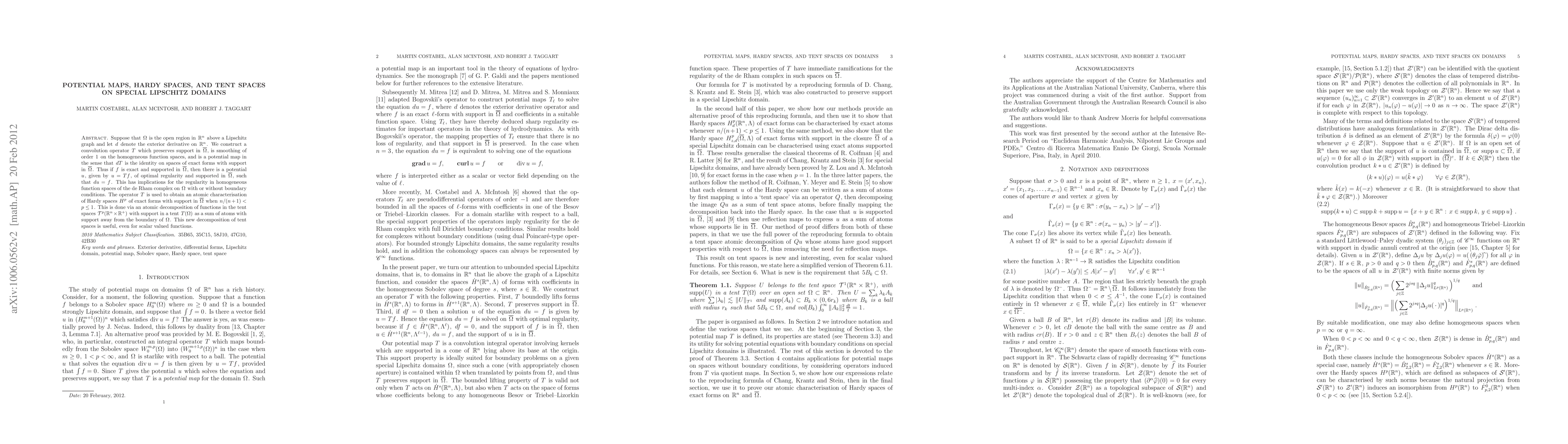 Suppose that $\Omega$ is the open region in $\mathbb{R}^n$ above a Lipschitz graph and let $d$ denote the exterior derivative on $\mathbb{R}^n$. We construct a convolution operator $T $ which preserves support in $\bar{\Omega$}, is smoothing of order 1 on the homogeneous function spaces, and is a potential map in the sense that $dT$ is the identity on spaces of exact forms with support in $\bar\Omega$. Thus if $f$ is exact and supported in $\bar\Omega$, then there is a potential $u$, given by $u=Tf$, of optimal regularity and supported in $\bar\Omega$, such that $du=f$. This has implications for the regularity in homogeneous function spaces of the de Rham complex on $\Omega$ with or without boundary conditions. The operator $T$ is used to obtain an atomic characterisation of Hardy spaces $H^p$ of exact forms with support in $\bar\Omega$ when $n/(n+1)