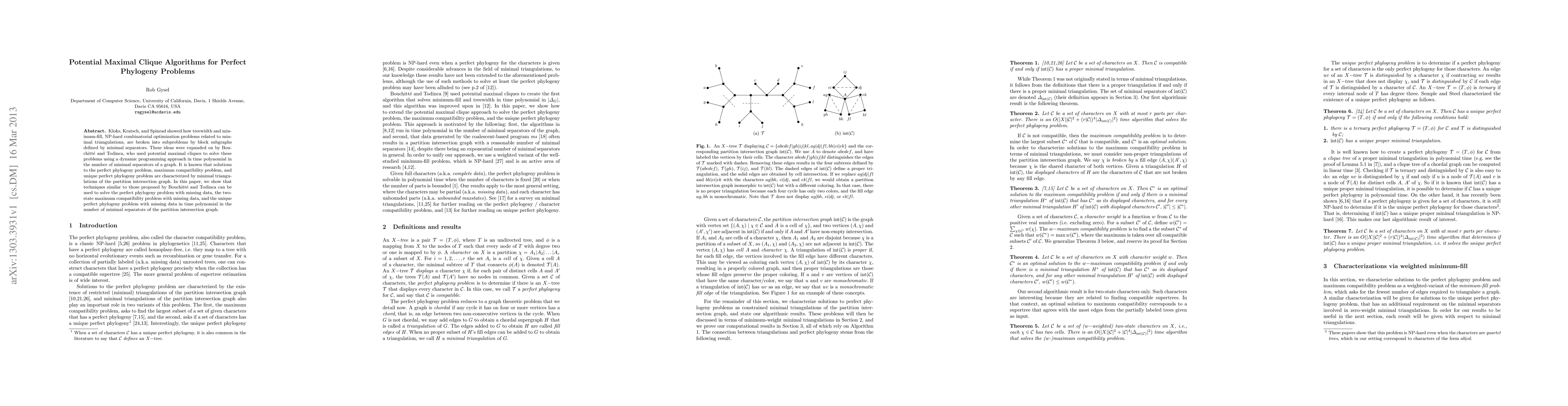 This paper demonstrates that dynamic programming techniques utilizing potential maximal cliques can efficiently solve the perfect phylogeny problem, the two-state maximum compatibility problem, and the unique perfect phylogeny problem, even when data is missing, with a runtime polynomial in the number of minimal separators. The approach builds on prior work by Bouchitt\'e and Todinca.