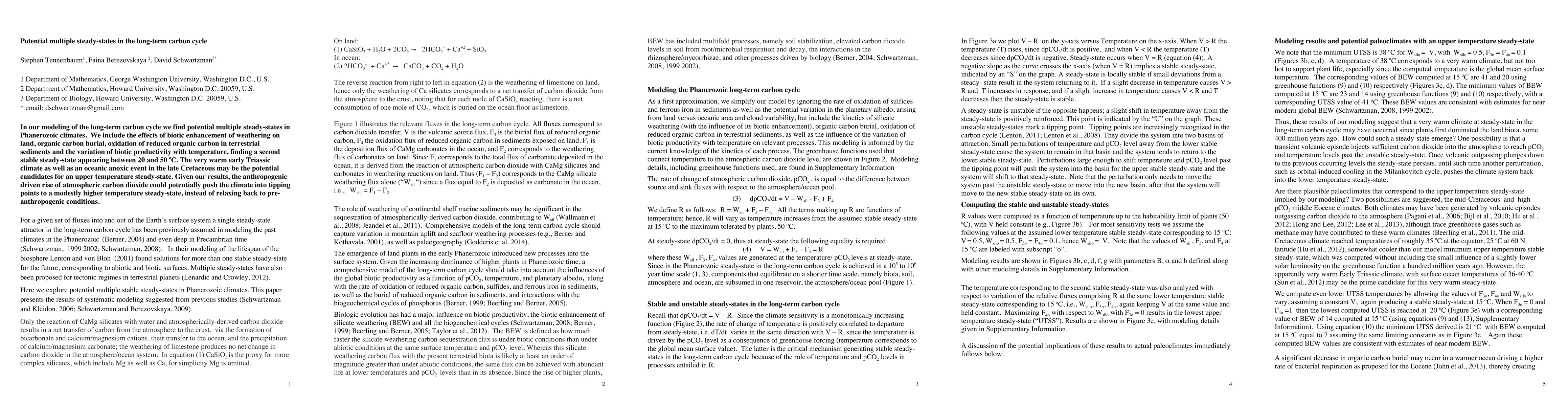 This research models the long-term carbon cycle and identifies potential multiple steady-states in Phanerozoic climates, including a second stable state between 20 and 50°C. The study suggests that anthropogenic CO2 rise could push climate into a higher temperature steady-state, rather than returning to pre-industrial conditions.