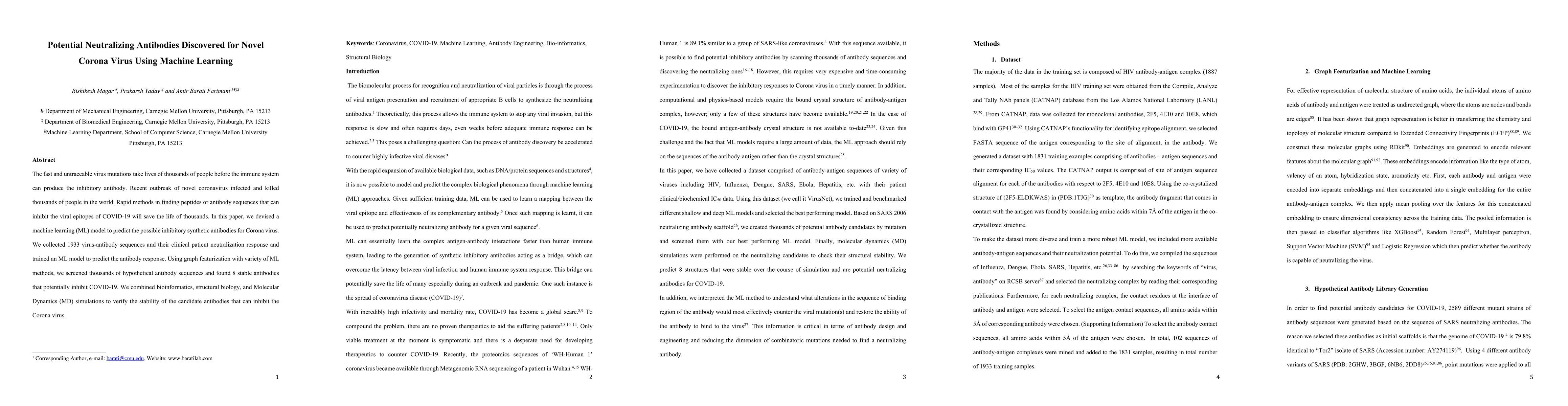 This paper employs machine learning to predict potential neutralizing antibodies against the novel coronavirus by analyzing 1933 virus-antibody sequences. The study identifies 8 stable antibodies that could inhibit COVID-19, verified through bioinformatics, structural biology, and molecular dynamics simulations.