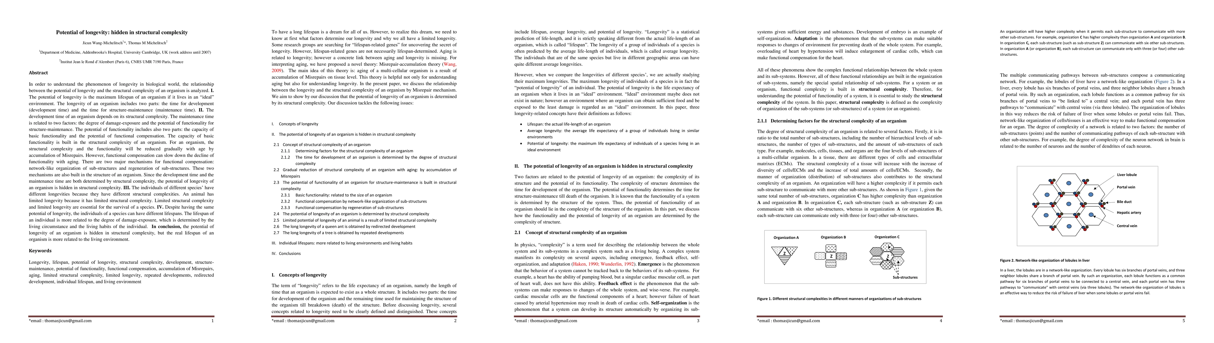 This paper explores the relationship between an organism's potential longevity and its structural complexity, concluding that longevity potential is inherent in structural complexity, while actual lifespan is more influenced by environmental damage exposure.