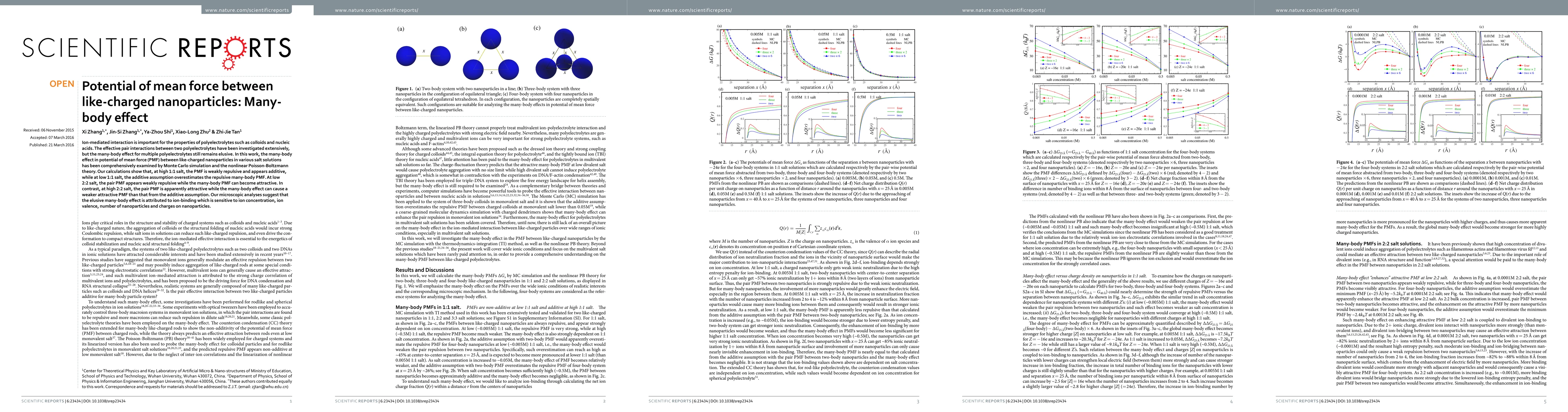 This research investigates the many-body effect on the potential of mean force (PMF) between like-charged nanoparticles in various salt solutions using Monte Carlo simulations and nonlinear Poisson-Boltzmann theory. The study reveals that the many-body effect is influenced by ion concentration, valence, and nanoparticle characteristics, leading to complex interactions that differ from simple additive assumptions.