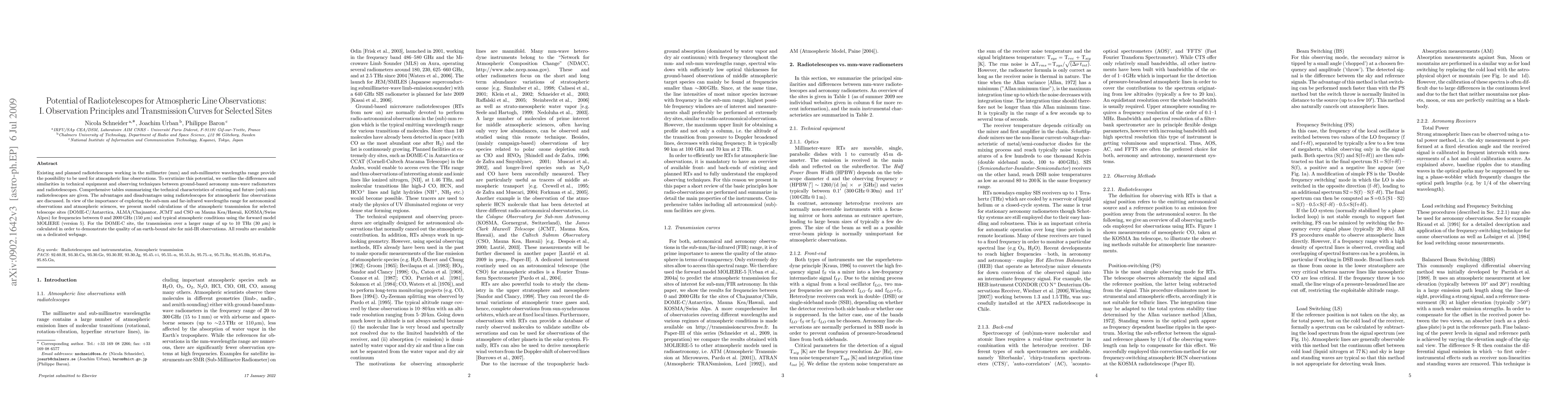 This paper explores the potential of radiotelescopes for atmospheric line observations, comparing mm-wave radiometers and radiotelescopes. It provides model calculations of atmospheric transmission for various telescope sites across different frequency ranges. Results are available on a dedicated webpage.