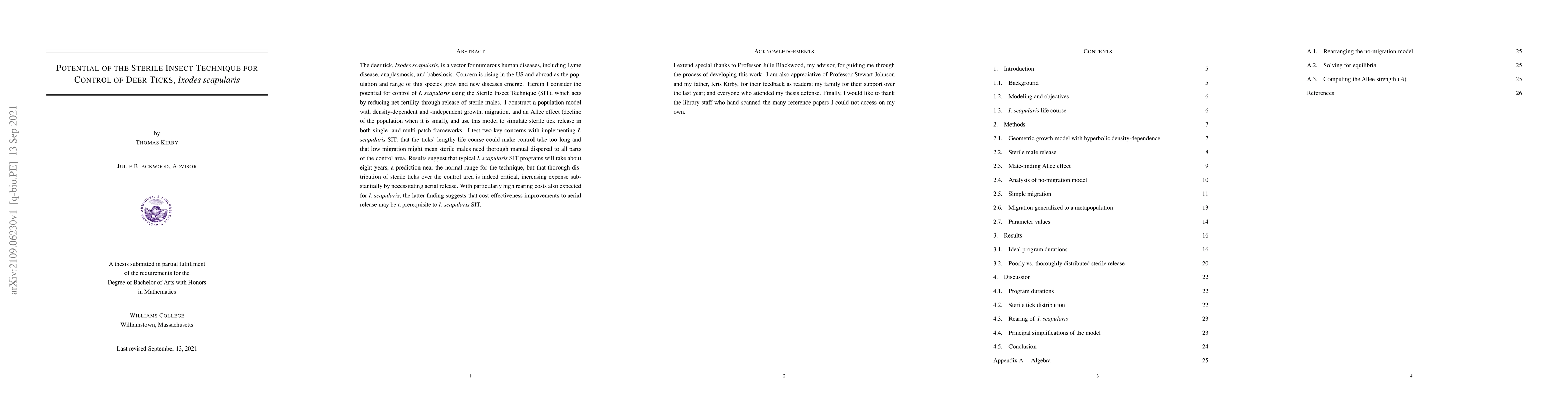 This paper explores the Sterile Insect Technique (SIT) for controlling the deer tick, $\textit{Ixodes scapularis}$, which spreads diseases like Lyme disease. The study models SIT's effectiveness, finding that control could take about eight years, and emphasizes the necessity of thorough aerial dispersal of sterile ticks to ensure success.