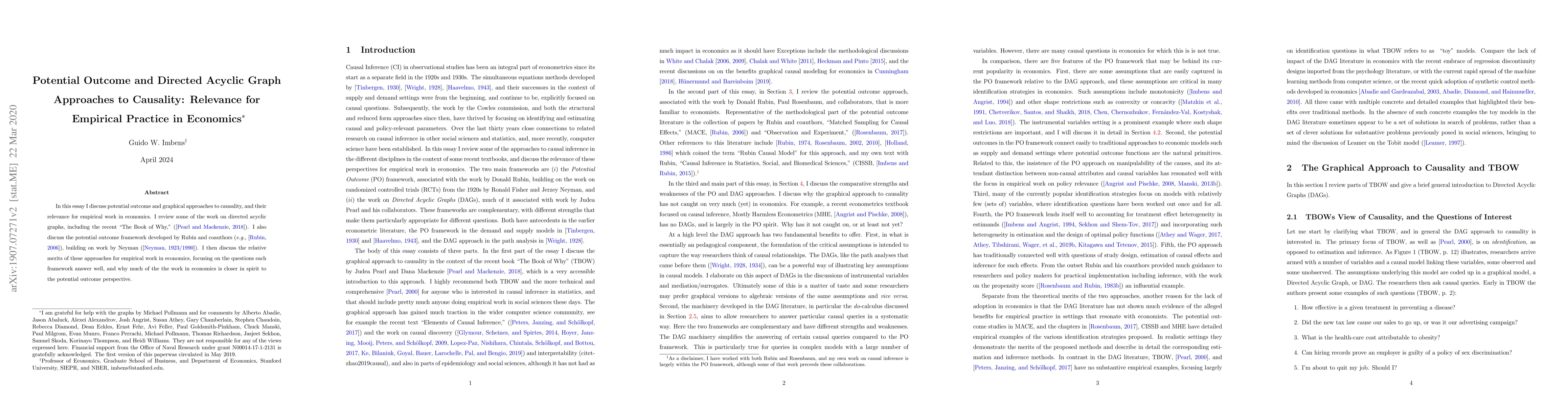 In this essay I discuss potential outcome and graphical approaches to causality, and their relevance for empirical work in economics. I review some of the work on directed acyclic graphs, including the recent "The Book of Why," by Pearl and MacKenzie. I also discuss the potential outcome framework developed by Rubin and coauthors, building on work by Neyman. I then discuss the relative merits of these approaches for empirical work in economics, focusing on the questions each answer well, and why much of the the work in economics is closer in spirit to the potential outcome framework.