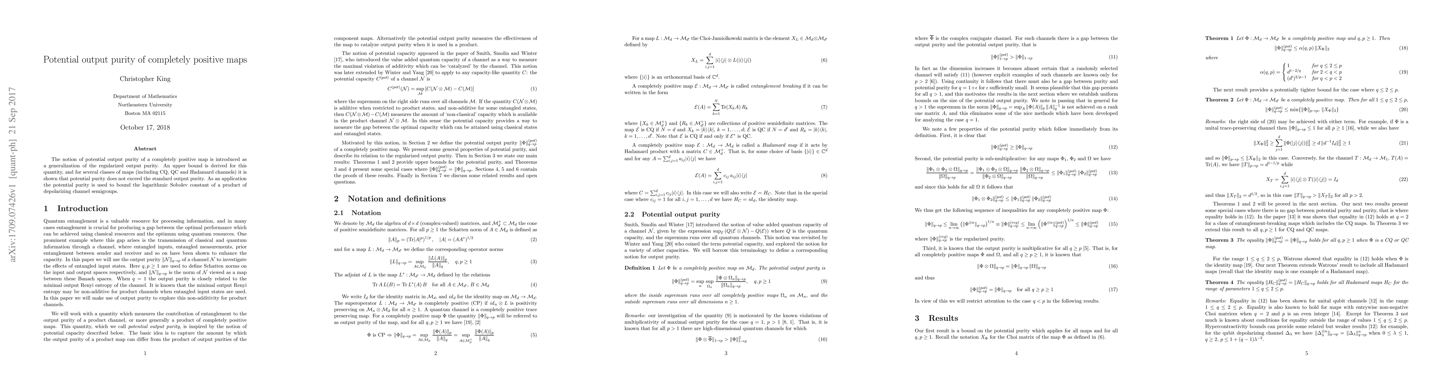 The notion of potential output purity of a completely positive map is introduced as a generalization of the regularized output purity. An upper bound is derived for this quantity, and for several classes of maps (including CQ, QC and Hadamard channels) it is shown that potential purity does not exceed the standard output purity. As an application the potential purity is used to bound the logarithmic Sobolev constant of a product of depolarizing channel semigroups.