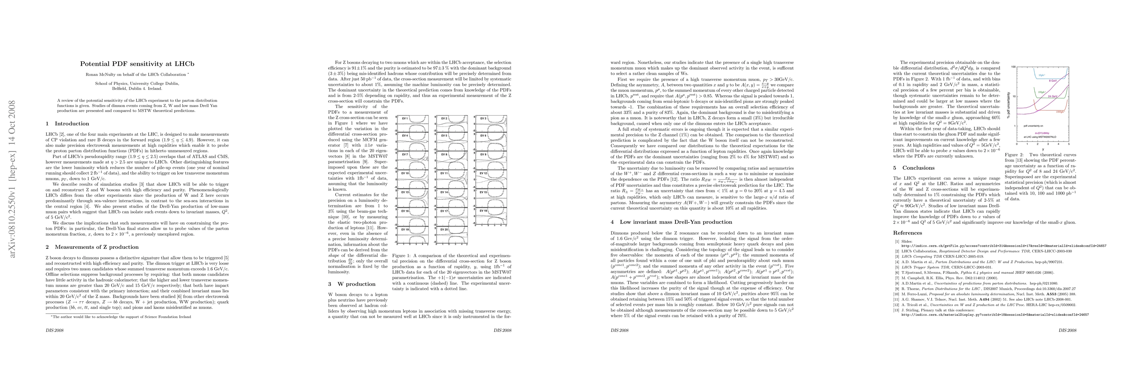 The LHCb experiment's sensitivity to parton distribution functions was reviewed, with studies on dimuon events from Z, W, and Drell-Yan production showing potential for improving theoretical predictions.