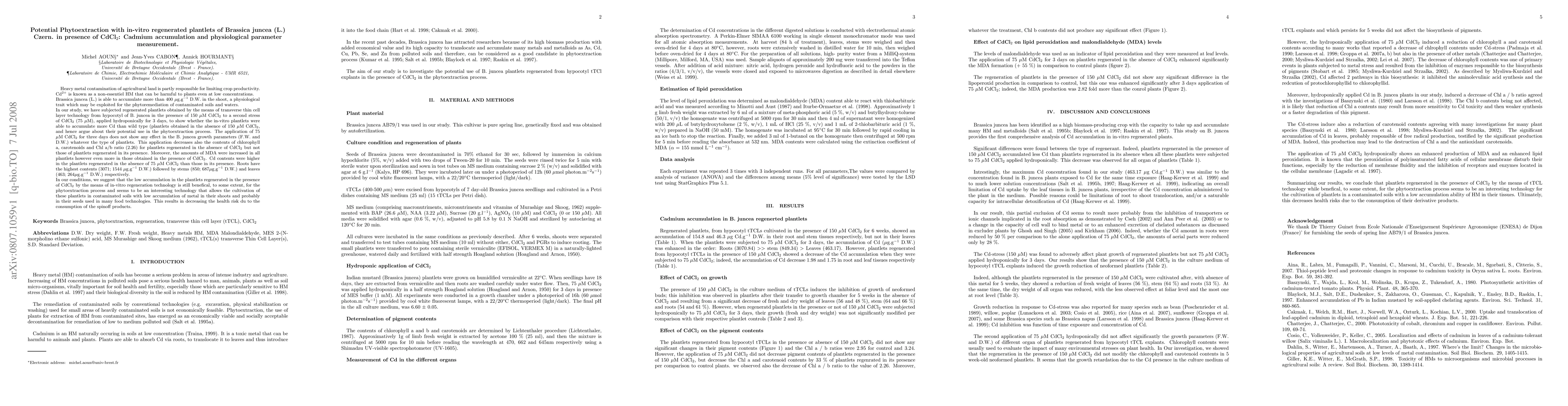 Heavy metal contamination of agricultural land is partly responsible for limiting crop productivity. Cd$^{2+}$ is known as a non-essentiel HM that can be harmful to plants even at low concentrations. Brassica juncea (L.) is able to accumulate more than 400 $\mu$g.g$^{-1}$ D.W. in the shoot, a physiological trait which may be exploited for the phytoremediation of contaminated soils and waters. . The application of 75 $\mu$M CdCl$_2$ for three days does not show any effect in the B. juncea growth parameters (F.W. and D.W.) whatever the type of plantlets. This application decreases also the contents of chlorophyll a, carotenoids and Chl a/b ratio (2.26) for plantlets regenerated in the absence of CdCl$_2$ but not those of plantlets regenerated in its presence. Roots have the highest contents (3071; 1544 $\mu$g.g$^{-1}$ D.W.) followed by stems (850; 687$\mu$g.g$^{-1}$ D.W.) and leaves (463; 264$\mu$g.g$^{-1}$ D.W.) respectively. In our conditions, we suggest that the low accumulation in the plantlets regenerated in the presence of CdCl$_2$ by the means of in-vitro regeneration technology is still benefical, to some extent, for the phytoextraction process and seems to be an interesting technology that allows the cultivation of these plantlets in contaminated soils with low accumulation of metal in their shoots and probably in their seeds used in many food technologies.