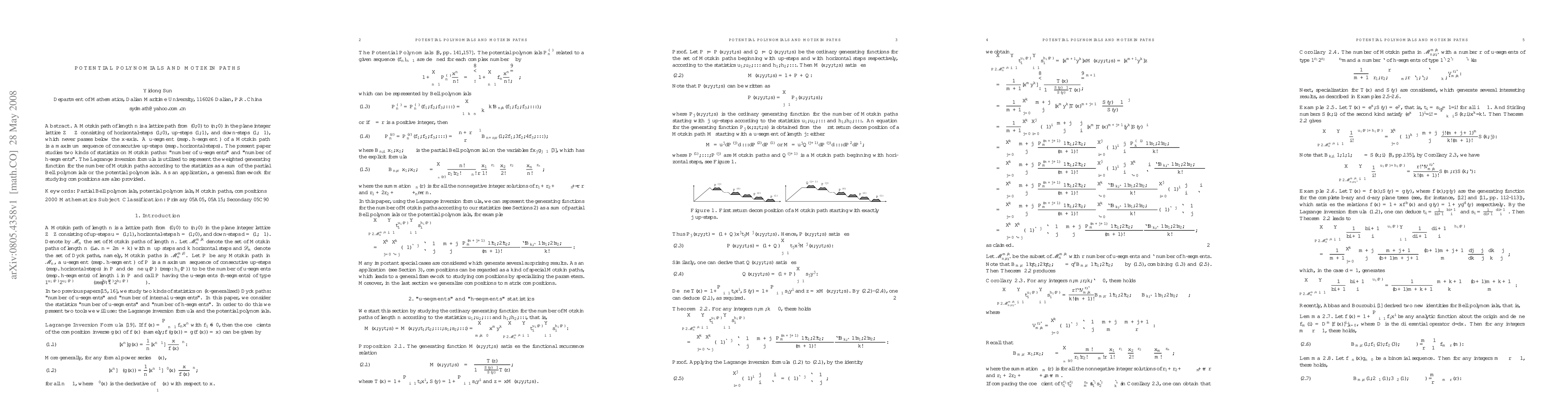 This paper investigates Motzkin paths, focusing on the statistics of "number of $u$-segments" and "number of $h$-segments," and uses the Lagrange inversion formula to express their weighted generating functions via potential polynomials. It also provides a framework for studying compositions.