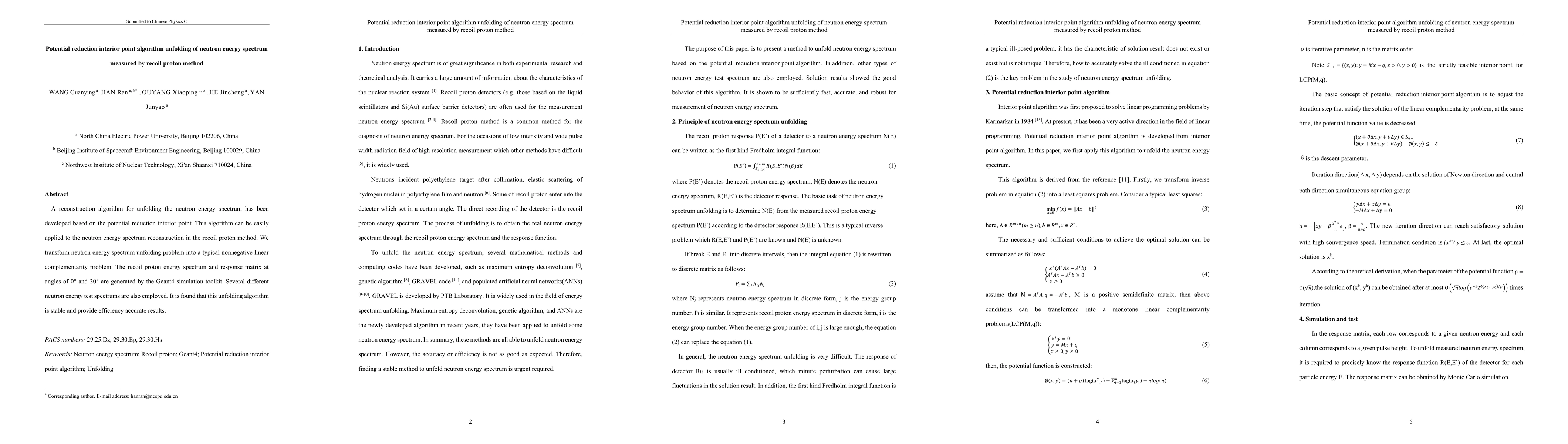 This paper presents a reconstruction algorithm based on potential reduction interior points for unfolding neutron energy spectra using the recoil proton method. The algorithm transforms the problem into a nonnegative linear complementarity problem and demonstrates stability and accuracy through Geant4 simulations and various neutron energy test spectra.