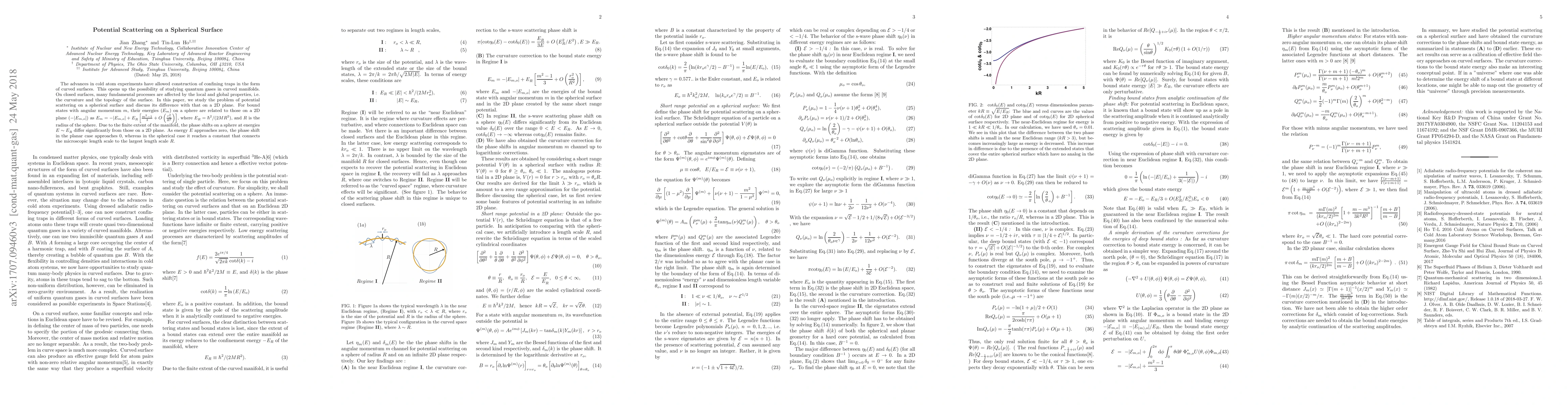 The advances in cold atom experiments have allowed construction of confining traps in the form of curved surfaces. This opens up the possibility of studying quantum gases in curved manifolds. On closed surfaces, many fundamental processes are affected by the local and global properties, i.e. the curvature and the topology of the surface. In this paper, we study the problem of potential scattering on a spherical surface and discuss its difference with that on a 2D plane. For bound states with angular momentum $m$, their energies ($E_{m}$) on a sphere are related to those on a 2D plane ($-|E_{m,o}|$) as $E_{m}= - |E_{m, o}| + E_{R}^{} \left[ \frac{m^2-1}{3} + O\left( \frac{r_o^2}{R^2} \right) \right] $, where $E_{R}^{} = \hbar^2/(2M R^2)$, and $R$ is the radius of the sphere. Due to the finite extent of the manifold, the phase shifts on a sphere at energies $E\sim E_{R}^{}$ differ significantly from those on a 2D plane. As energy $E$ approaches zero, the phase shift in the planar case approaches $0$, whereas in the spherical case it reaches a constant that connects the microscopic length scale to the largest length scale $R$.