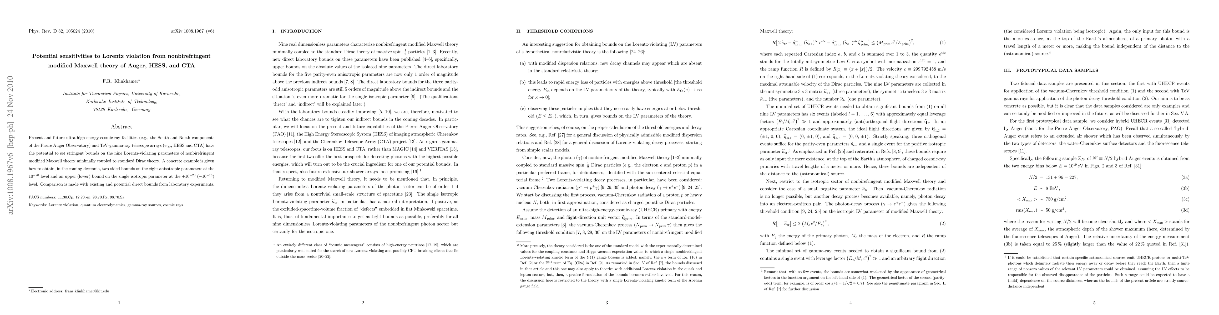 This paper explores how future ultra-high-energy cosmic ray observatories and TeV gamma-ray telescopes can set stringent limits on Lorentz-violating parameters in nonbirefringent modified Maxwell theory. It demonstrates the potential to achieve two-sided bounds on anisotropic parameters at the 10^-20 level and an upper/lower bound on the isotropic parameter at +10^-20 and -10^-16 levels, respectively.