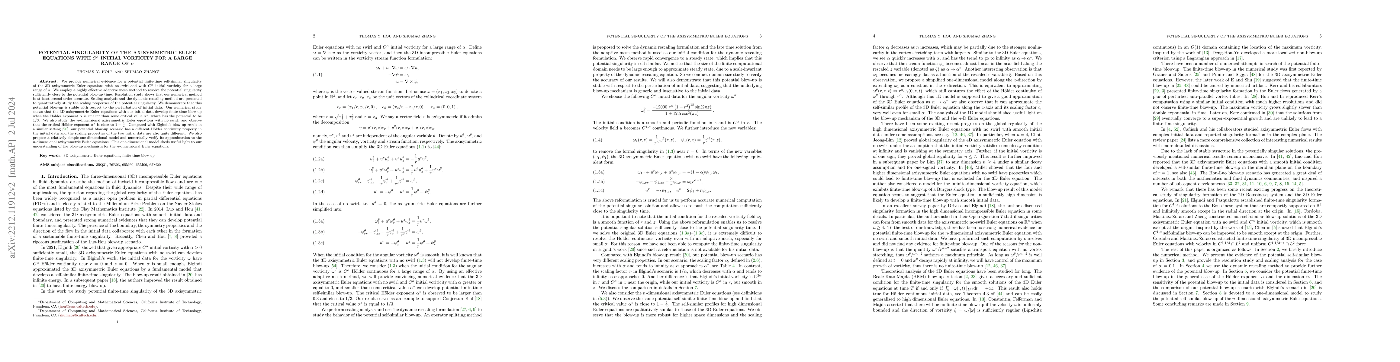 This paper presents numerical evidence suggesting a potential finite-time singularity in the 3D axisymmetric Euler equations with $C^\alpha$ initial vorticity, particularly when $\alpha$ is less than a critical value $\alpha^*$. The study uses an adaptive mesh method to analyze scaling properties and blow-up stability.