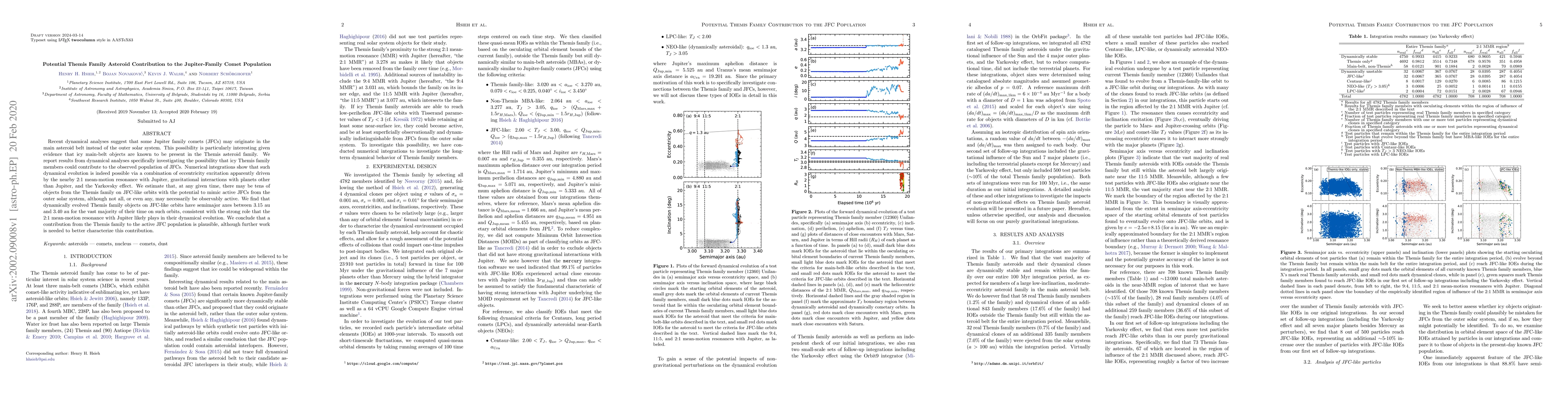 Recent dynamical analyses suggest that Jupiter family comets (JFCs) may originate from the Themis asteroid family in the main belt, driven by eccentricity excitation via Jupiter's 2:1 resonance, planetary interactions, and the Yarkovsky effect. This implies tens of Themis family objects could potentially transition to JFC-like orbits, though their active state remains uncertain.