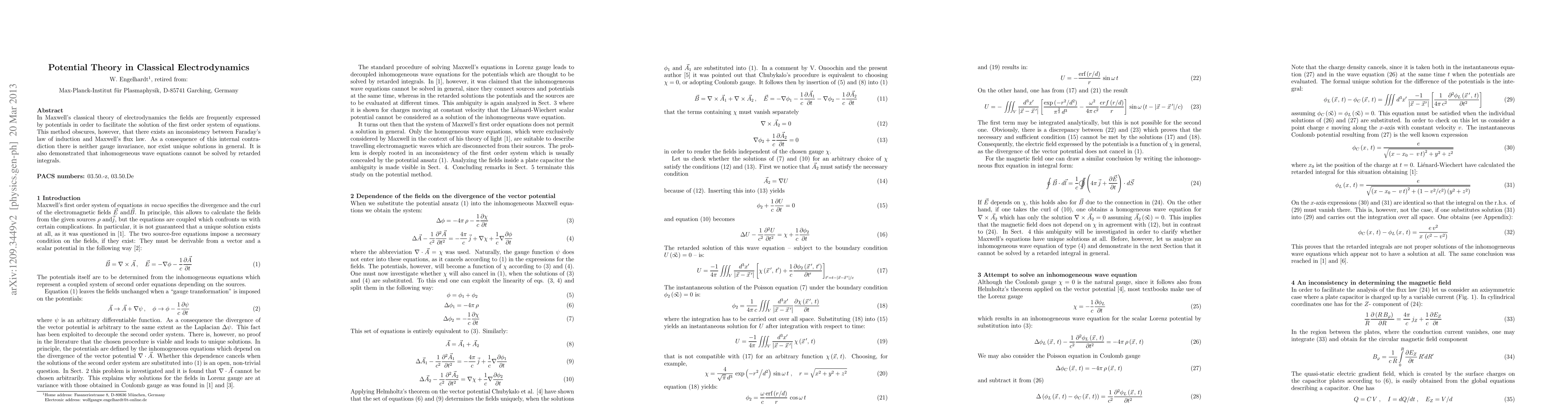 In Maxwell's classical theory of electrodynamics the fields are frequently expressed by potentials in order to facilitate the solution of the first order system of equations. This method obscures, however, that there exists an inconsistency between Faraday's law of induction and Maxwell's flux law. As a consequence of this internal contradiction there is neither gauge invariance, nor exist unique solutions in general. It is also demonstrated that inhomogeneous wave equations cannot be solved by retarded integrals.