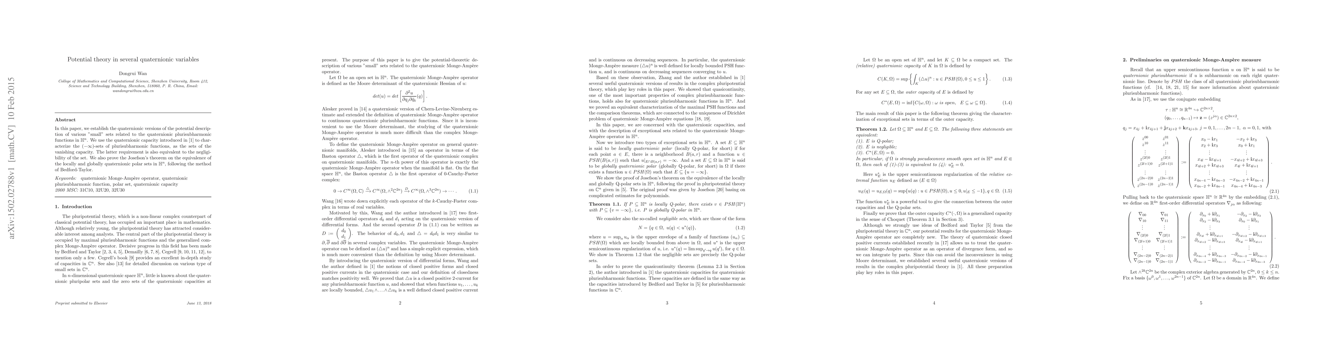In this paper, we establish the quaternionic versions of the potential description of various "small" sets related to the quaternionic plurisubharmonic functions in $\mathbb{H}^n$. We use the quaternionic capacity introduced in \cite{wan4} to characterize the $(-\infty)$-sets of plurisubharmonic functions, as the sets of the vanishing capacity. The latter requirement is also equivalent to the negligibility of the set. We also prove the Josefson's theorem on the equivalence of the locally and globally quaternionic polar sets in $\mathbb{H}^n$, following the method of Bedford-Taylor.