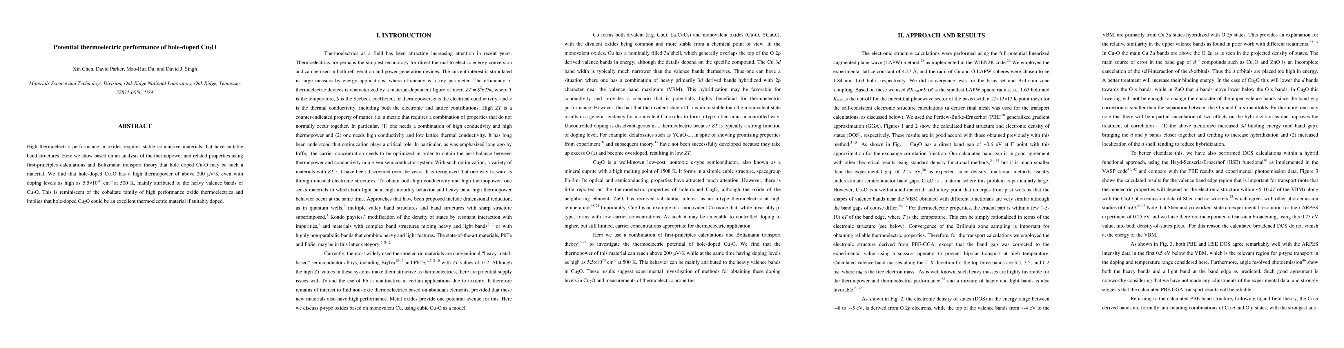 This paper demonstrates that hole-doped Cu2O exhibits high thermoelectric performance with a thermopower of over 200 microV/K at 500 K, suggesting it could be a promising thermoelectric material due to its suitable band structure and heavy valence bands.
