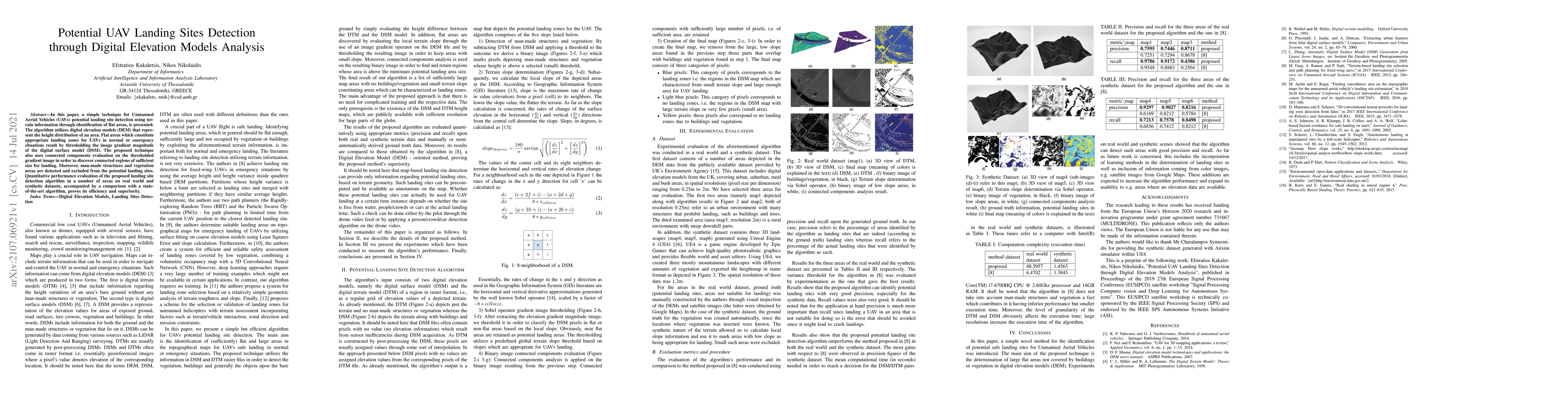 This paper presents a method for detecting potential UAV landing sites using digital elevation models (DEM) to identify flat areas. The algorithm processes the digital surface model (DSM) to find suitable landing zones, excluding man-made structures and vegetation, and demonstrates superior performance compared to existing techniques.