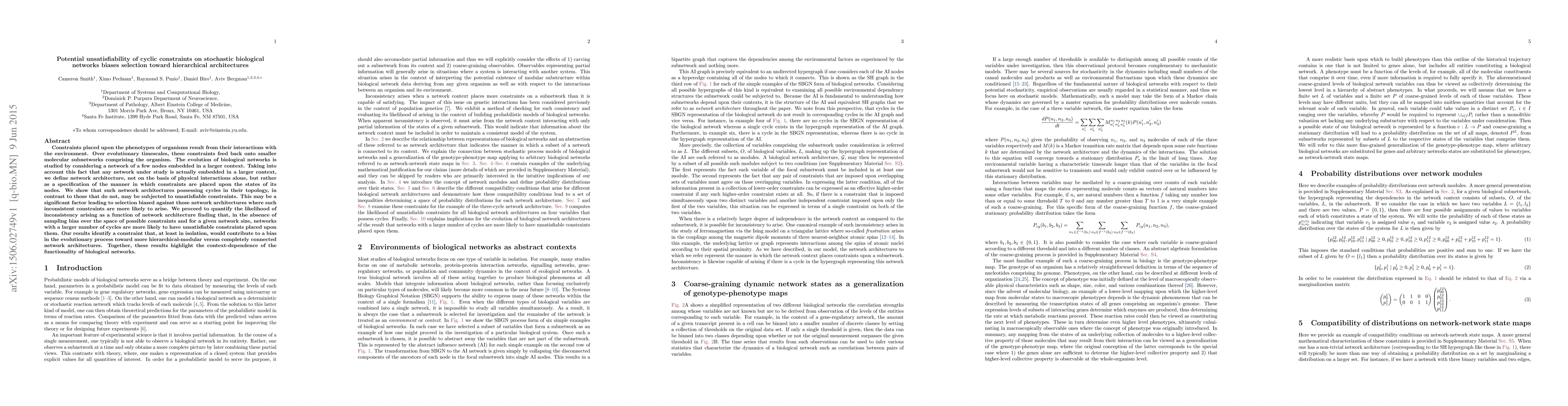 The research identifies that cyclic constraints in stochastic biological networks can lead to unsatisfiable conditions, potentially biasing evolution towards hierarchical, modular architectures rather than completely connected ones. This is quantified as a function of network architecture size and cycle count.