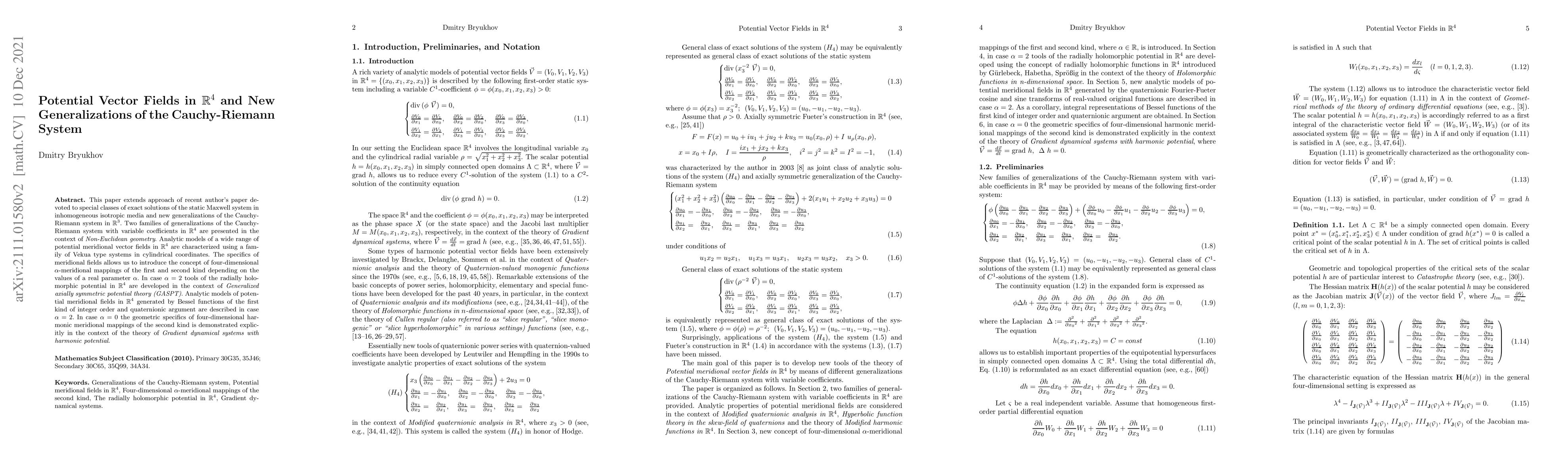 This paper extends approach of recent author's paper devoted to special classes of exact solutions of the static Maxwell system in inhomogeneous isotropic media and new generalizations of the Cauchy-Riemann system in $\mathbb R^3$. Two families of generalizations of the Cauchy-Riemann system with variable coefficients in $\mathbb R^4$ are presented in the context of non-Euclidean geometry. Analytic models of a wide range of potential meridional vector fields in $\mathbb R^4$ are characterized using a family of Vekua type systems in cylindrical coordinates. The specifics of meridional fields allows us to introduce the concept of four-dimensional $\alpha$-meridional mappings of the first and second kind depending on the values of a real parameter $\alpha$. In case $\alpha=2$ tools of the radially holomorphic potential in $\mathbb R^4$ are developed in the context of generalized axially symmetric potential theory (GASPT). Analytic models of potential meridional fields in $\mathbb R^4$ generated by Bessel functions of the first kind of integer order and quaternionic argument are described in case $\alpha=2$. In case $\alpha =0$ the geometric specifics of four-dimensional harmonic meridional mappings of the second kind is demonstrated explicitly in the context of the theory of gradient dynamical systems with harmonic potential.