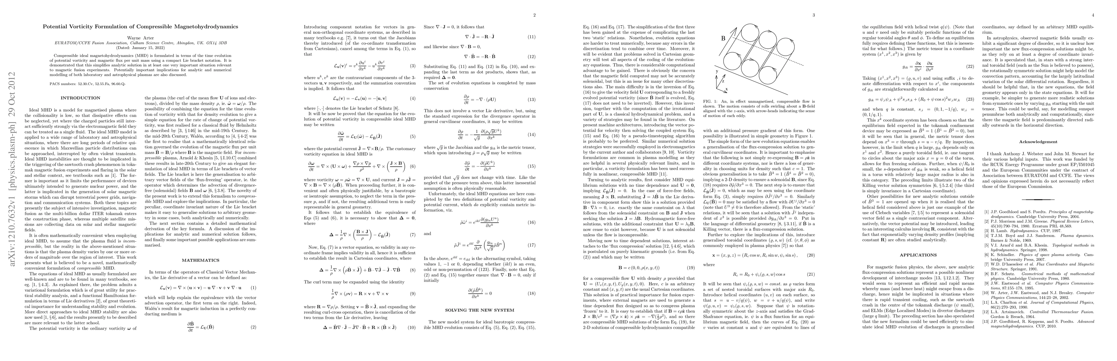 Compressible ideal magnetohydrodynamics (MHD) is formulated in terms of the time evolution of potential vorticity and magnetic flux per unit mass using a compact Lie bracket notation. It is demonstrated that this simplifies analytic solution in at least one very important situation relevant to magnetic fusion experiments. Potentially important implications for analytic and numerical modelling of both laboratory and astrophysical plasmas are also discussed.