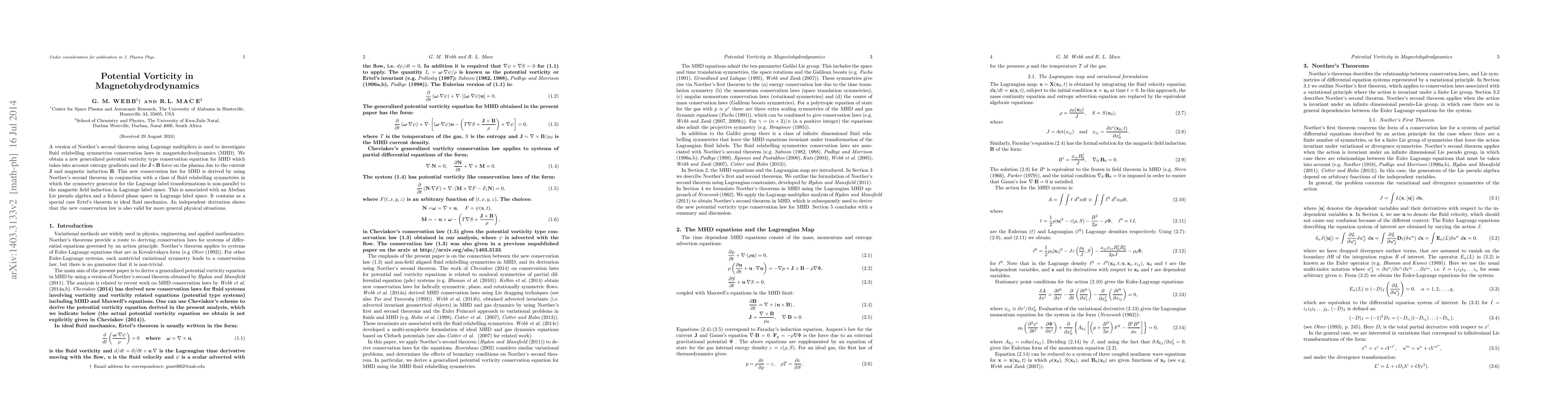 A version of Noether's second theorem using Lagrange multipliers is used to investigate fluid relabelling symmetries conservation laws in magnetohydrodynamics (MHD). We obtain a new generalized potential vorticity type conservation equation for MHD which takes into account entropy gradients and the ${\bf J}\times{\bf B}$ force on the plasma due to the current ${\bf J}$ and magnetic induction ${\bf B}$. This new conservation law for MHD is derived by using Noether's second theorem in conjunction with a class of fluid relabelling symmetries in which the symmetry generator for the Lagrange label transformations is non-parallel to the magnetic field induction in Lagrange label space. This is associated with an Abelian Lie pseudo algebra and a foliated phase space in Lagrange label space. It contains as a special case Ertel's theorem in ideal fluid mechanics. An independent derivation shows that the new conservation law is also valid for more general physical situations.