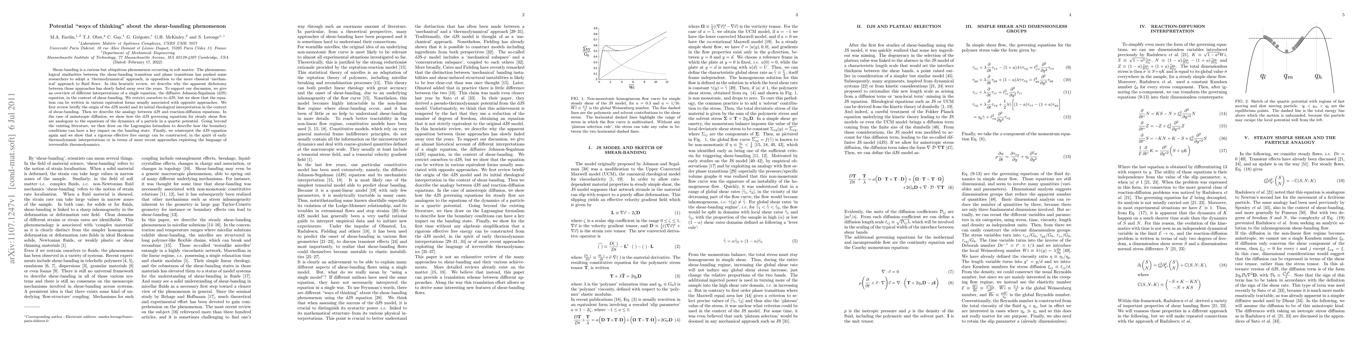 Shear-banding is a curious but ubiquitous phenomenon occurring in soft matter. The phenomenological similarities between the shear-banding transition and phase transitions has pushed some researchers to adopt a 'thermodynamical' approach, in opposition to the more classical 'mechanical' approach to fluid flows. In this heuristic review, we describe why the apparent dichotomy between those approaches has slowly faded away over the years. To support our discussion, we give an overview of different interpretations of a single equation, the diffusive Johnson-Segalman (dJS) equation, in the context of shear-banding. We restrict ourselves to dJS, but we show that the equation can be written in various equivalent forms usually associated with opposite approaches. We first review briefly the origin of the dJS model and its initial rheological interpretation in the context of shear-banding. Then we describe the analogy between dJS and reaction-diffusion equations. In the case of anisotropic diffusion, we show how the dJS governing equations for steady shear flow are analogous to the equations of the dynamics of a particle in a quartic potential. Going beyond the existing literature, we then draw on the Lagrangian formalism to describe how the boundary conditions can have a key impact on the banding state. Finally, we reinterpret the dJS equation again and we show that a rigorous effective free energy can be constructed, in the spirit of early thermodynamic interpretations or in terms of more recent approaches exploiting the language of irreversible thermodynamics.