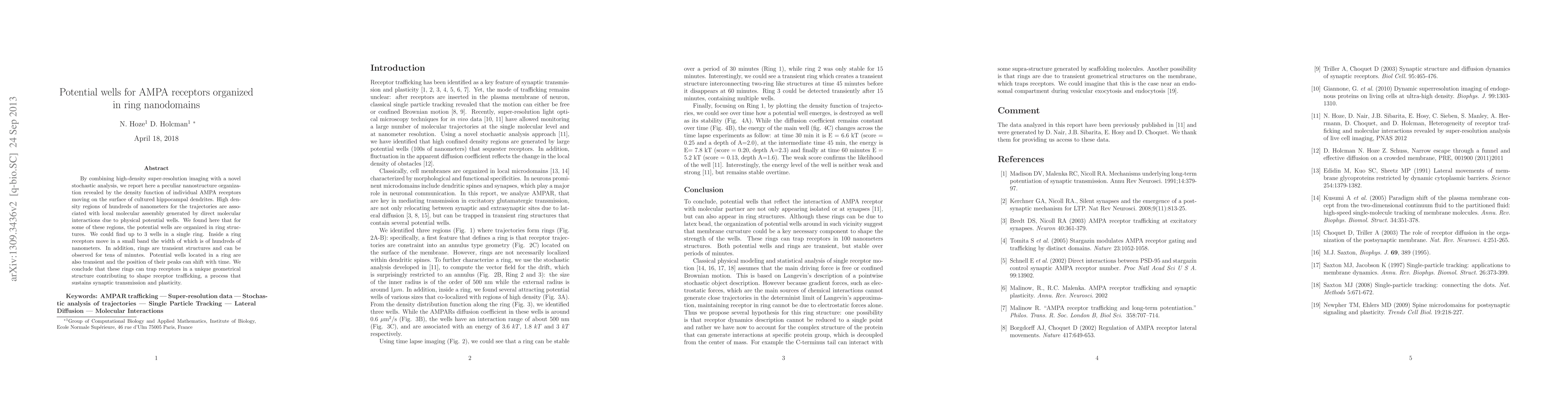 This study reveals that AMPA receptors on hippocampal dendrites form transient ring nanodomains with potential wells, trapping receptors and influencing their trafficking, which is crucial for synaptic transmission and plasticity. The rings, observed for tens of minutes, can contain up to three wells, each shifting position over time.