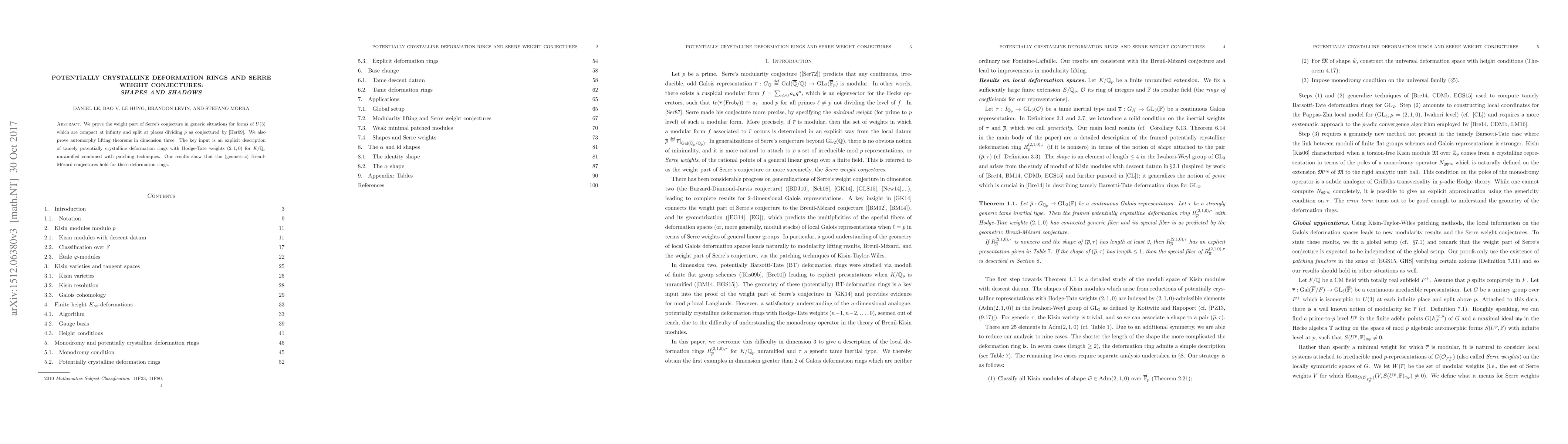 This paper proves the weight part of Serre's conjecture for forms of $U(3)$ under specific conditions and establishes automorphy lifting theorems in dimension three. The authors achieve this through an explicit description of tamely potentially crystalline deformation rings with Hodge-Tate weights $(2,1,0)$ and the application of patching techniques.