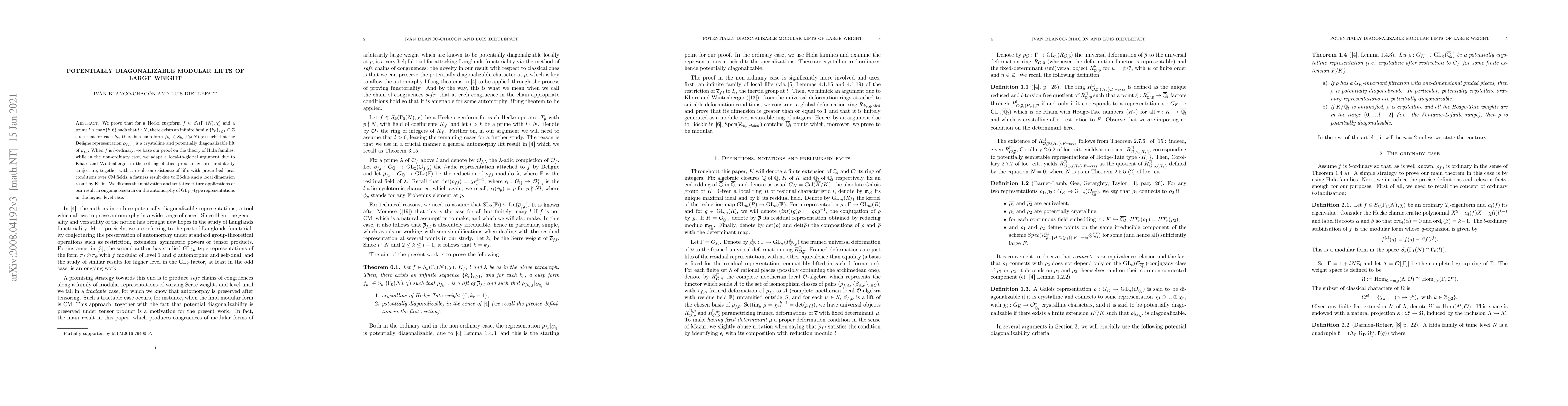 This paper proves the existence of potentially diagonalizable modular lifts of large weight for Hecke cuspforms, utilizing Hida families for ordinary cases and adapting Khare-Wintenberger's methods for non-ordinary cases. The result is motivated by ongoing research on the automorphy of $\mathrm{GL}_{2n}$-representations.