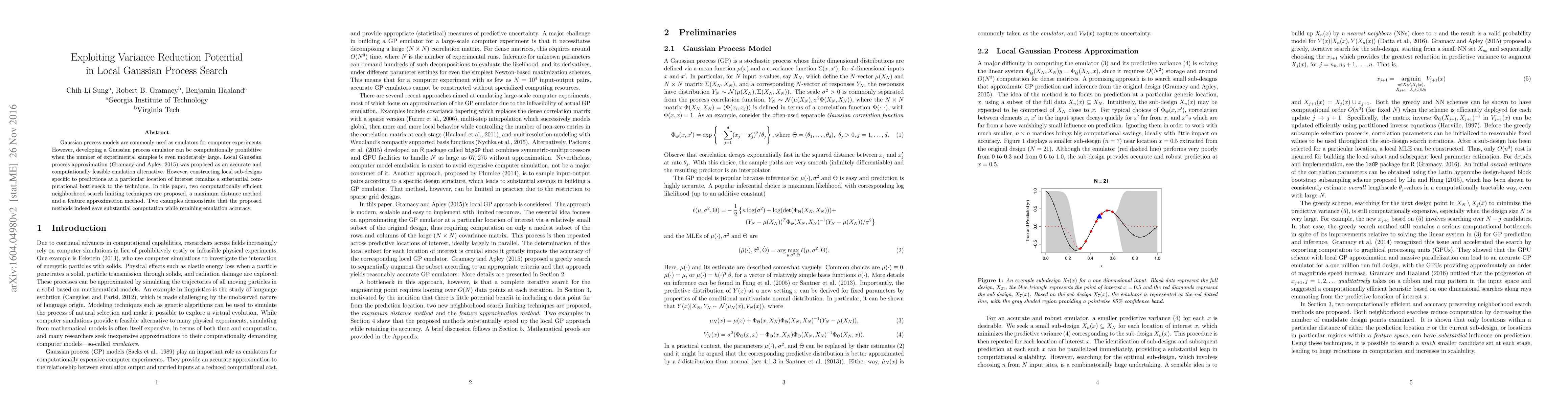 Gaussian process models are commonly used as emulators for computer experiments. However, developing a Gaussian process emulator can be computationally prohibitive when the number of experimental samples is even moderately large. Local Gaussian process approximation (Gramacy and Apley, 2015) was proposed as an accurate and computationally feasible emulation alternative. However, constructing local sub-designs specific to predictions at a particular location of interest remains a substantial computational bottleneck to the technique. In this paper, two computationally efficient neighborhood search limiting techniques are proposed, a maximum distance method and a feature approximation method. Two examples demonstrate that the proposed methods indeed save substantial computation while retaining emulation accuracy.