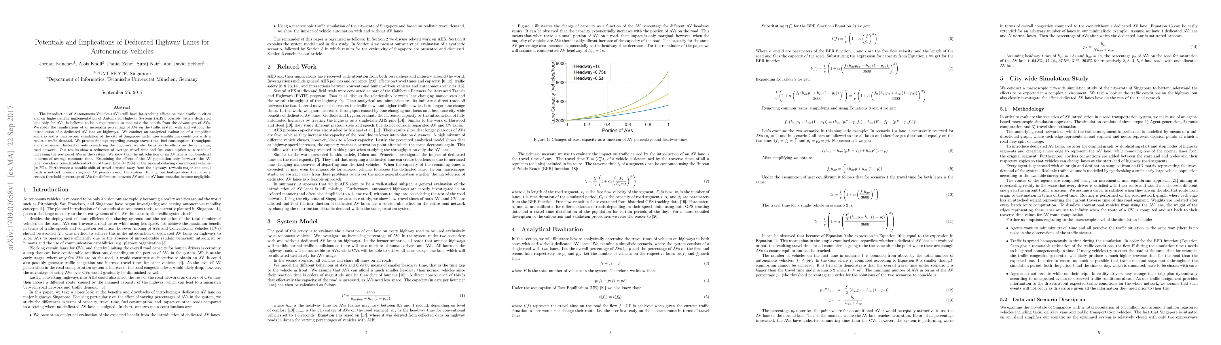 The introduction of autonomous vehicles (AVs) will have far-reaching effects on road traffic in cities and on highways.The implementation of automated highway system (AHS), possibly with a dedicated lane only for AVs, is believed to be a requirement to maximise the benefit from the advantages of AVs. We study the ramifications of an increasing percentage of AVs on the traffic system with and without the introduction of a dedicated AV lane on highways. We conduct an analytical evaluation of a simplified scenario and a macroscopic simulation of the city of Singapore under user equilibrium conditions with a realistic traffic demand. We present findings regarding average travel time, fuel consumption, throughput and road usage. Instead of only considering the highways, we also focus on the effects on the remaining road network. Our results show a reduction of average travel time and fuel consumption as a result of increasing the portion of AVs in the system. We show that the introduction of an AV lane is not beneficial in terms of average commute time. Examining the effects of the AV population only, however, the AV lane provides a considerable reduction of travel time (approx. 25%) at the price of delaying conventional vehicles (approx. 7%). Furthermore a notable shift of travel demand away from the highways towards major and small roads is noticed in early stages of AV penetration of the system. Finally, our findings show that after a certain threshold percentage of AVs the differences between AV and no AV lane scenarios become negligible.