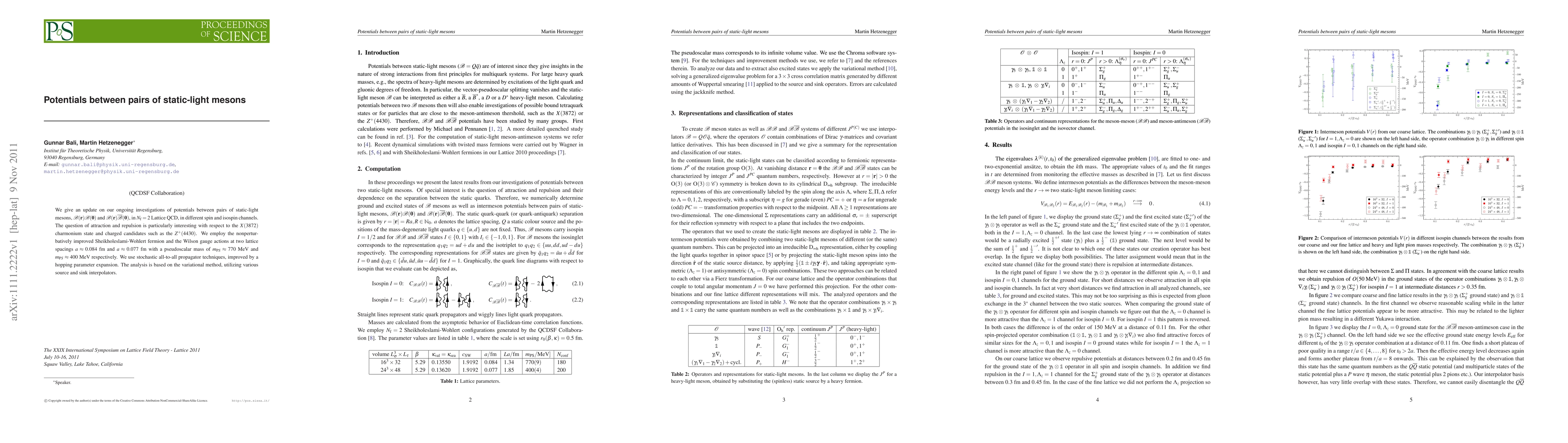 We give an update on our ongoing investigations of potentials between pairs of static-light mesons in Nf=2 Lattice QCD, in different spin and isospin channels. The question of attraction and repulsion is particularly interesting with respect to the X(3872) charmonium state and charged candidates such as the Z+(4430). We employ the nonperturbatively improved Sheikholeslami-Wohlert fermion and the Wilson gauge actions at two lattice spacings a approx. 0.084 fm and a approx. 0.077 fm with a pseudoscalar mass of mPS approx. 770 MeV and mPS approx. 400 MeV respectively. We use stochastic all-to-all propagator techniques, improved by a hopping parameter expansion. The analysis is based on the variational method, utilizing various source and sink interpolators.
