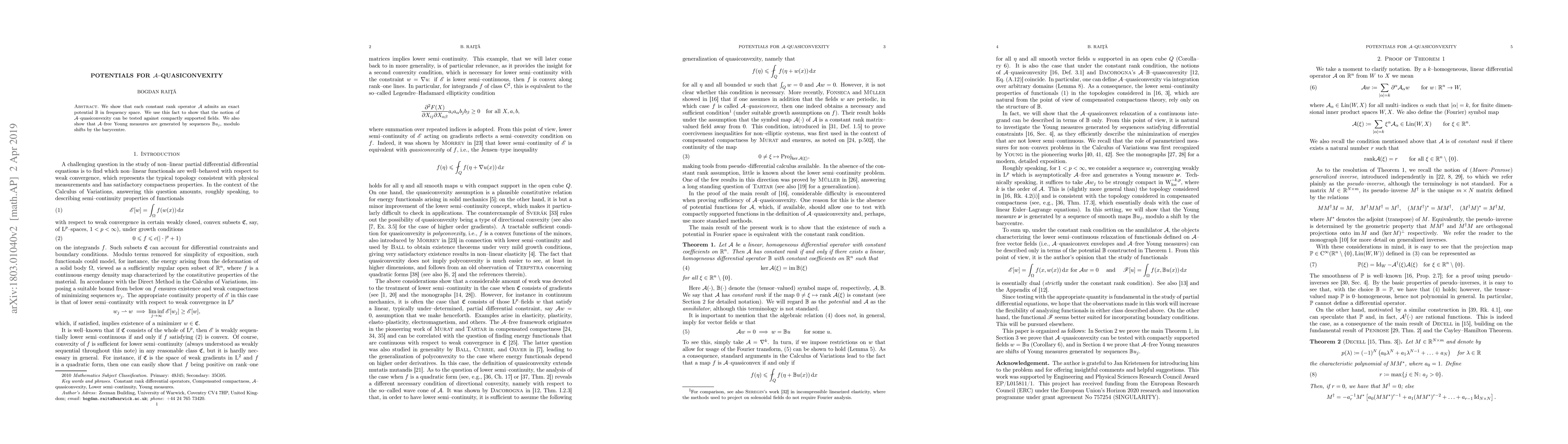 Summary: This paper demonstrates that constant rank operators $\mathcal{A}$ possess exact potential $\mathbb{B}$ in frequency space, allowing for testing of $\mathcal{A}$-quasiconvexity against compactly supported fields, and shows that $\mathcal{A}$-free Young measures arise from sequences $\mathbb{B}u_j$ with possible barycentre shifts.