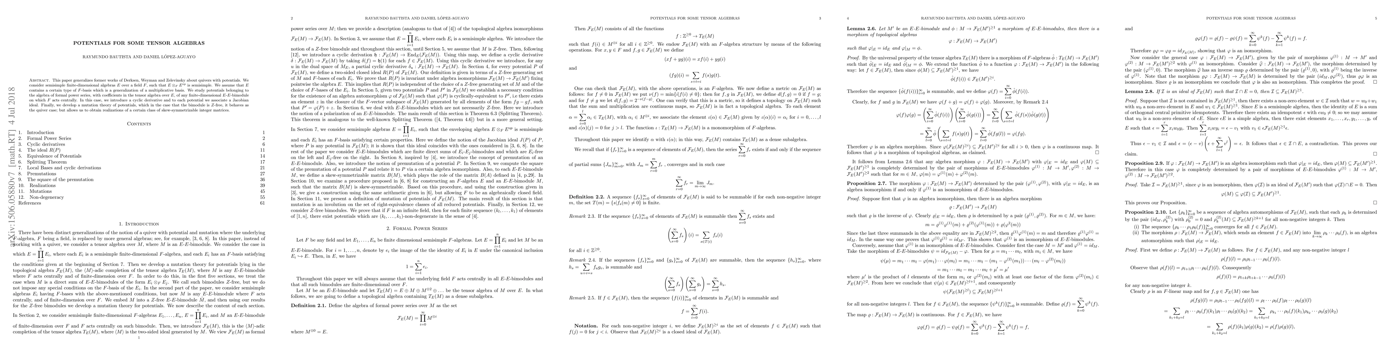 This paper investigates tensor algebras, specifically studying potentials belonging to formal power series with coefficients in a tensor algebra over a semisimple finite-dimensional algebra. It introduces a mutation theory of potentials that generalizes the quiver case and allows for realizations of certain integer matrices.